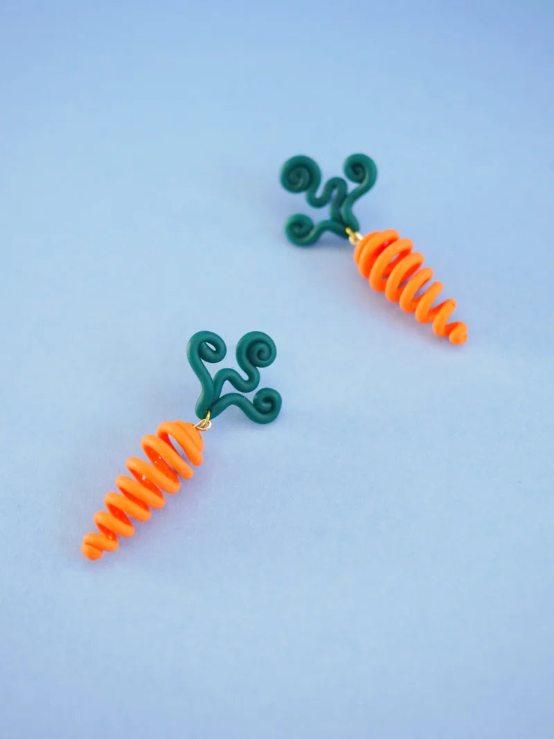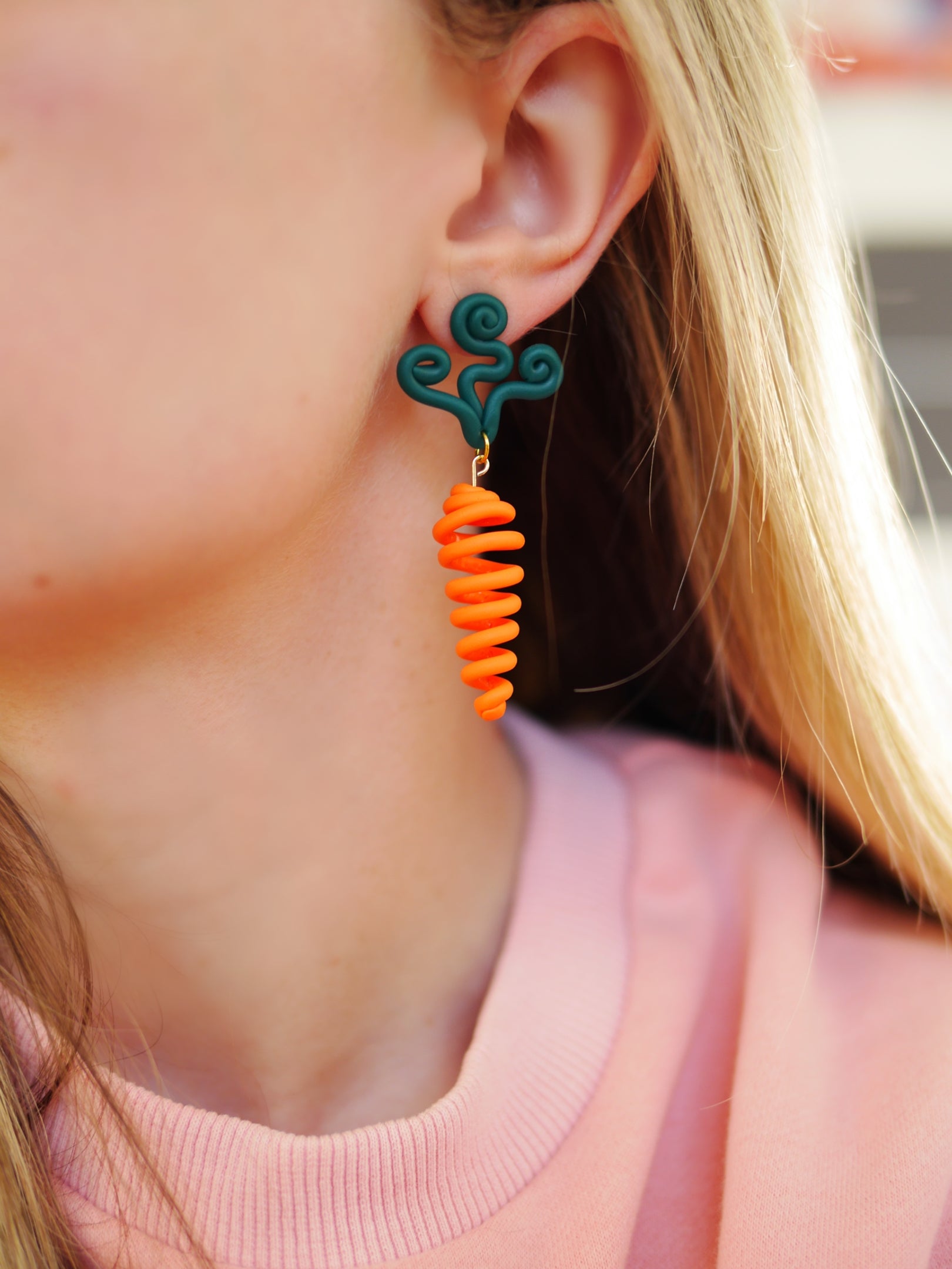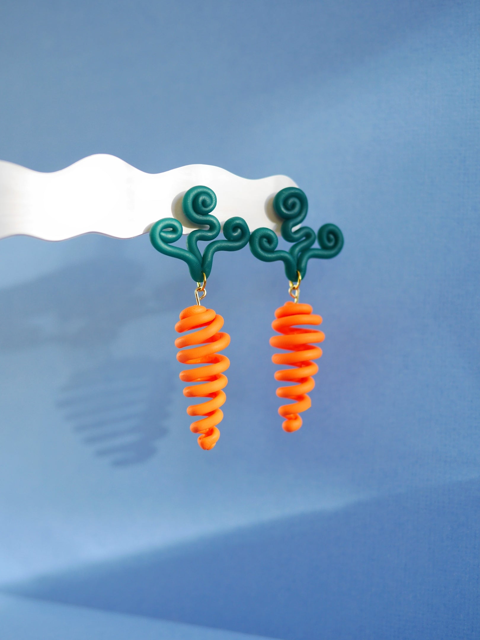 Hand sculpted 3D polymer clay carrot earrings. Lightweight, total piece length is ~1.25 inches. Studs are surgical grade stainless steel (100% hypoallergenic).