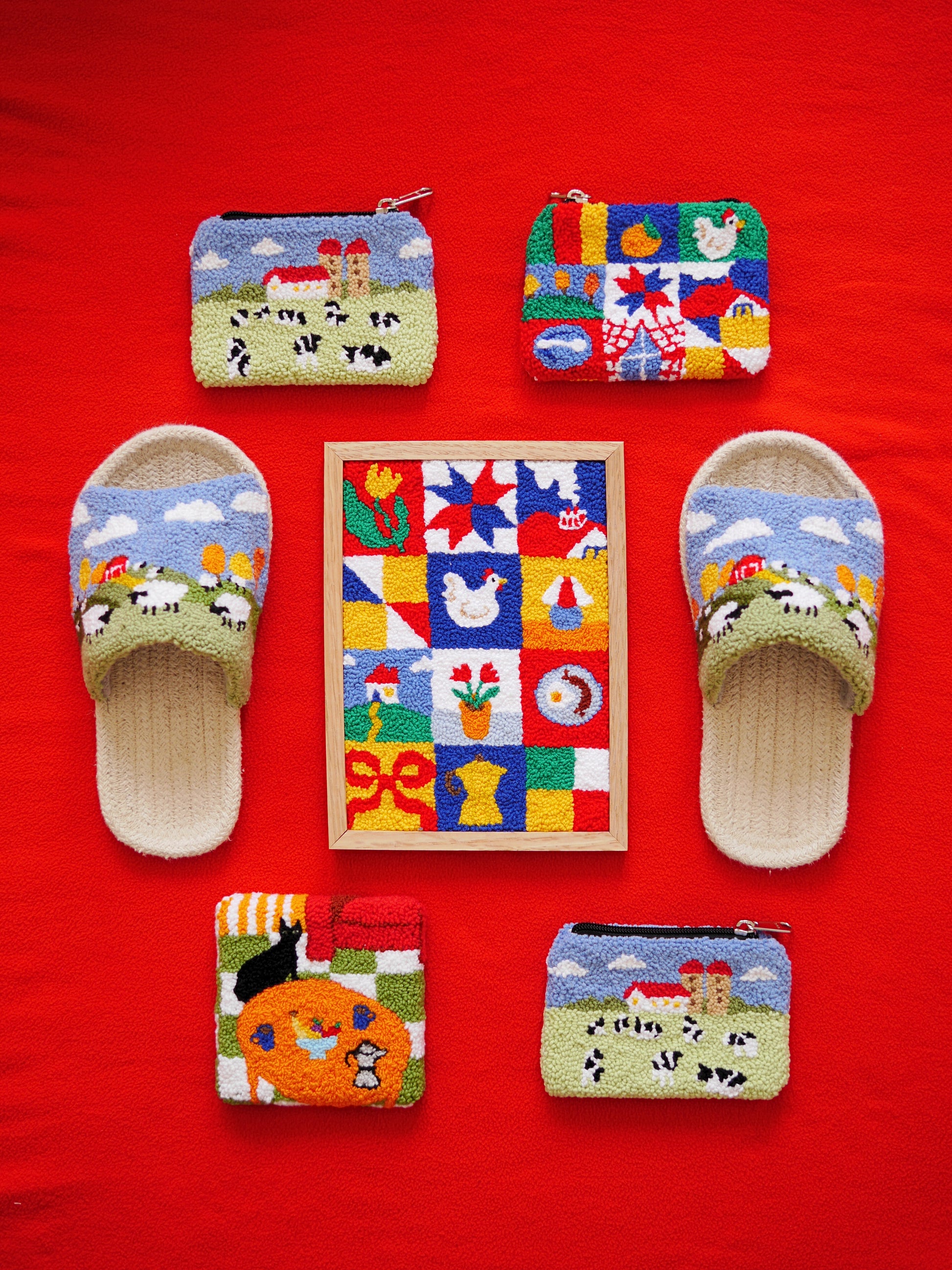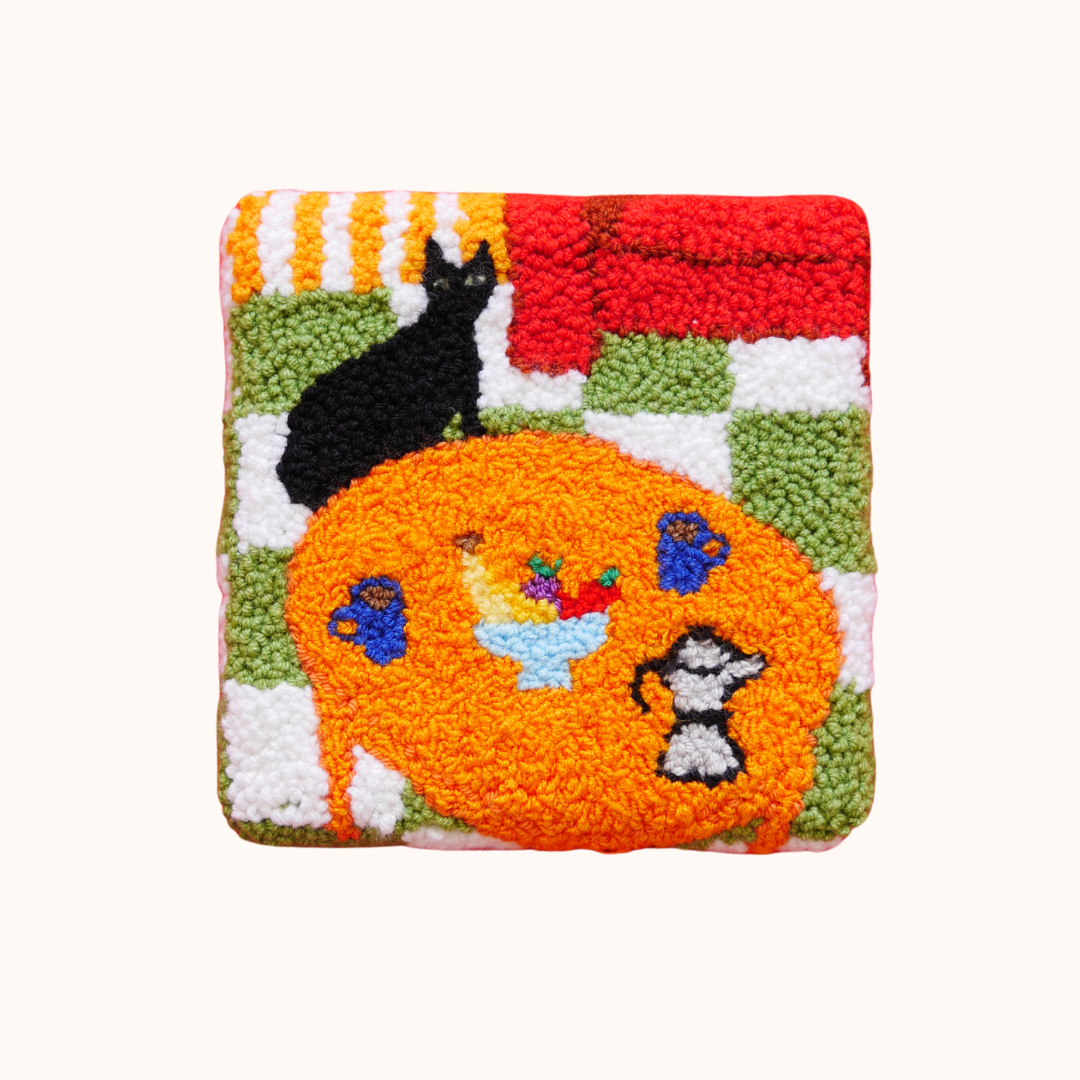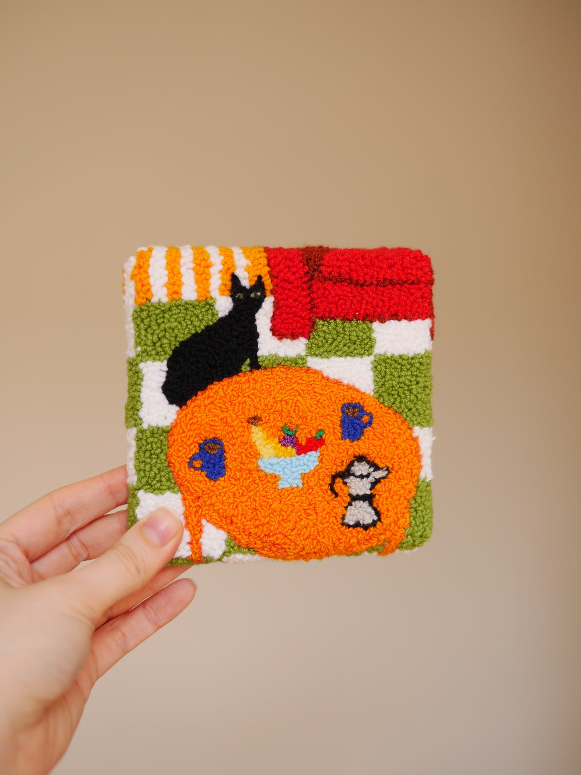 Features a hand punch needled living room scene that has been stretched over a small canvas in order to be hung on your wall. A wonderful addition to the home!