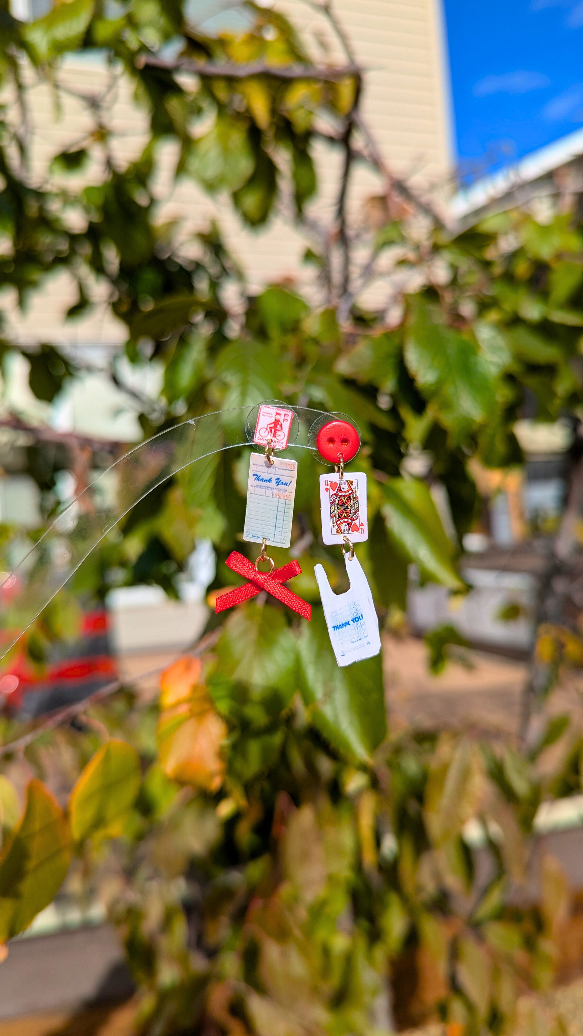 Handmade earrings featuring a mixture of polymer clay, miniature photo charms sealed in resin, and ribbon. All charms are hand cut.