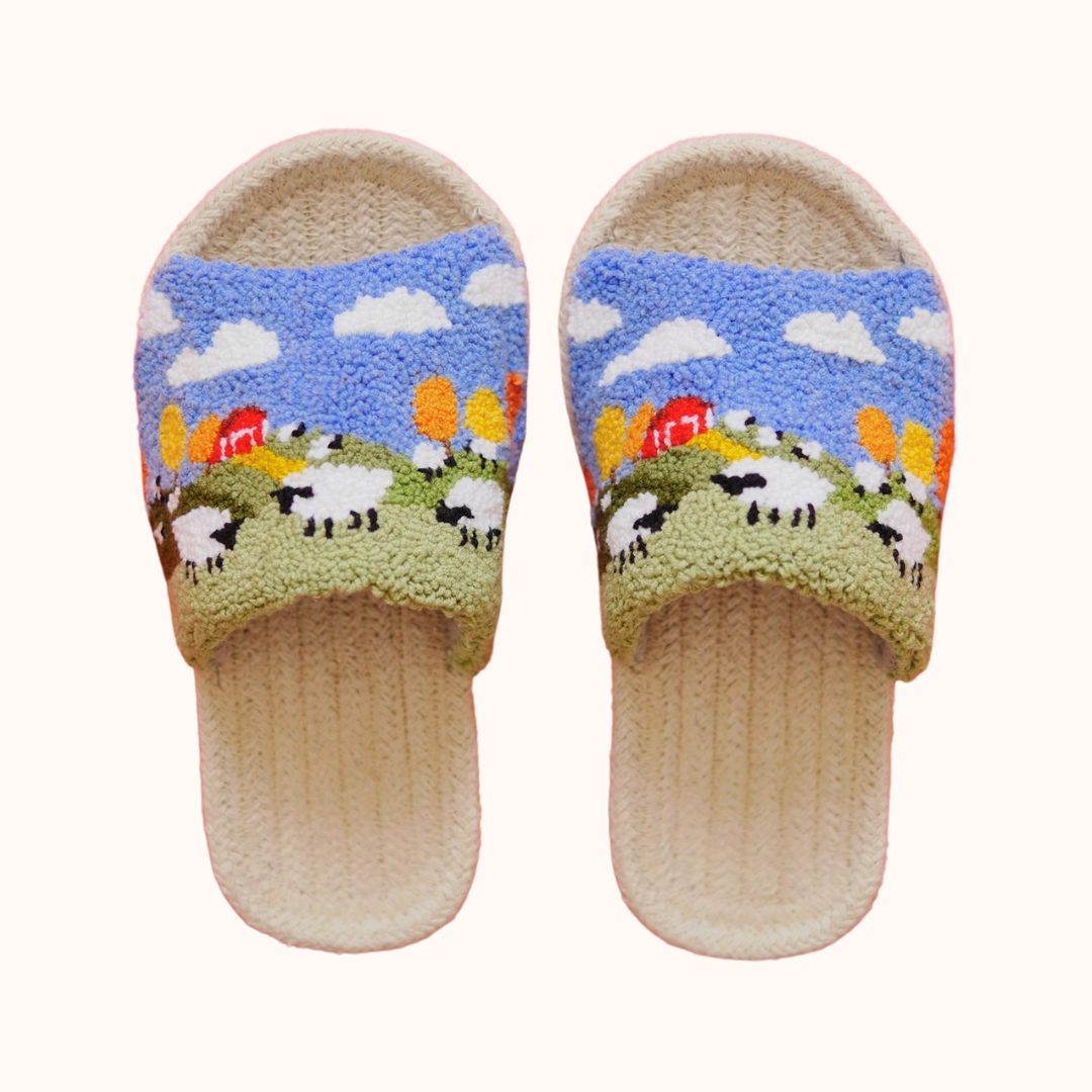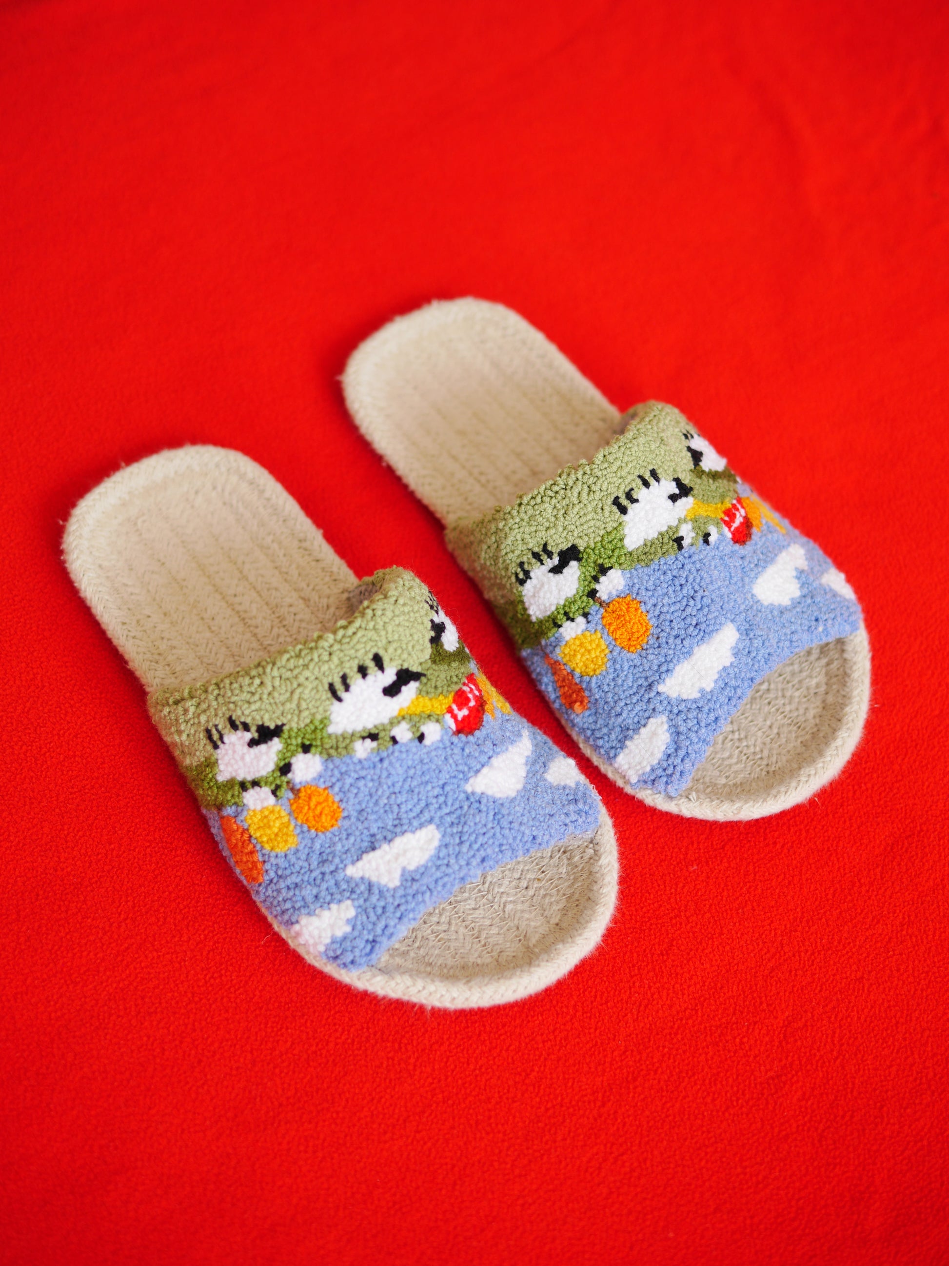 A handmade pair of embroidered slippers featuring a woven rope base. The perfect slippers / slides for summer.