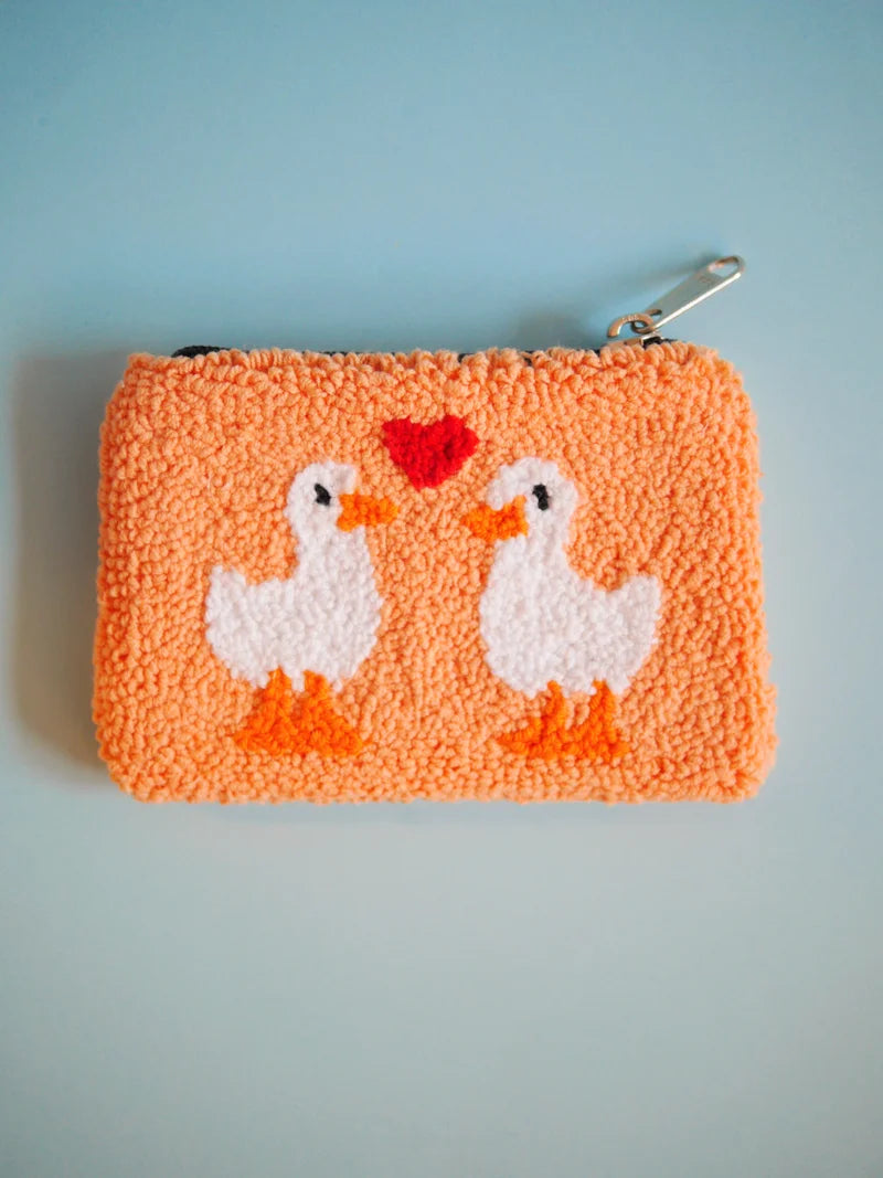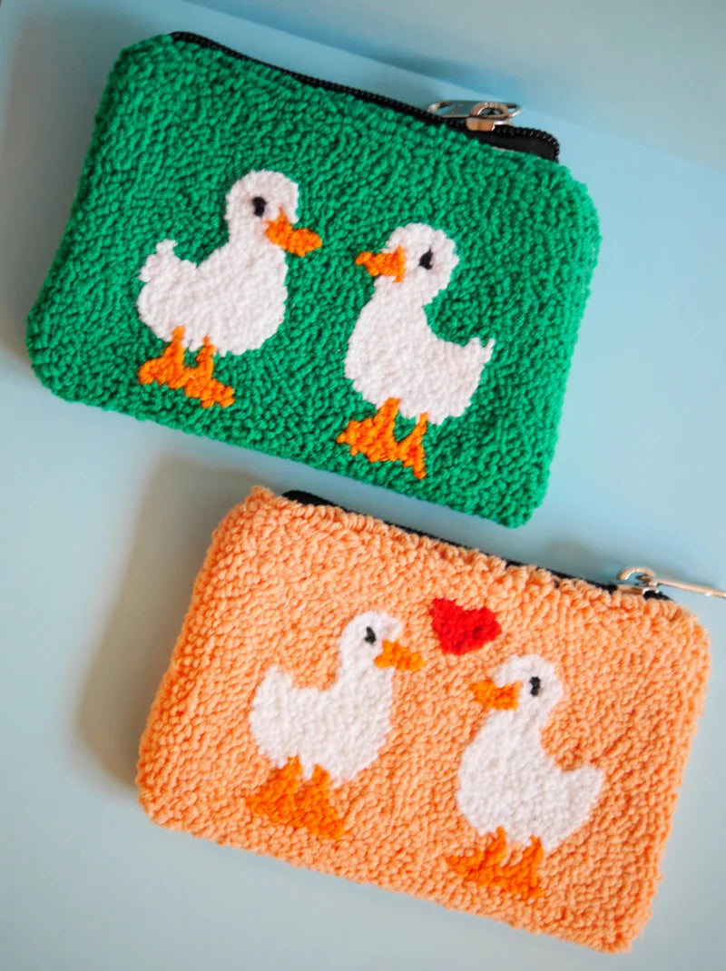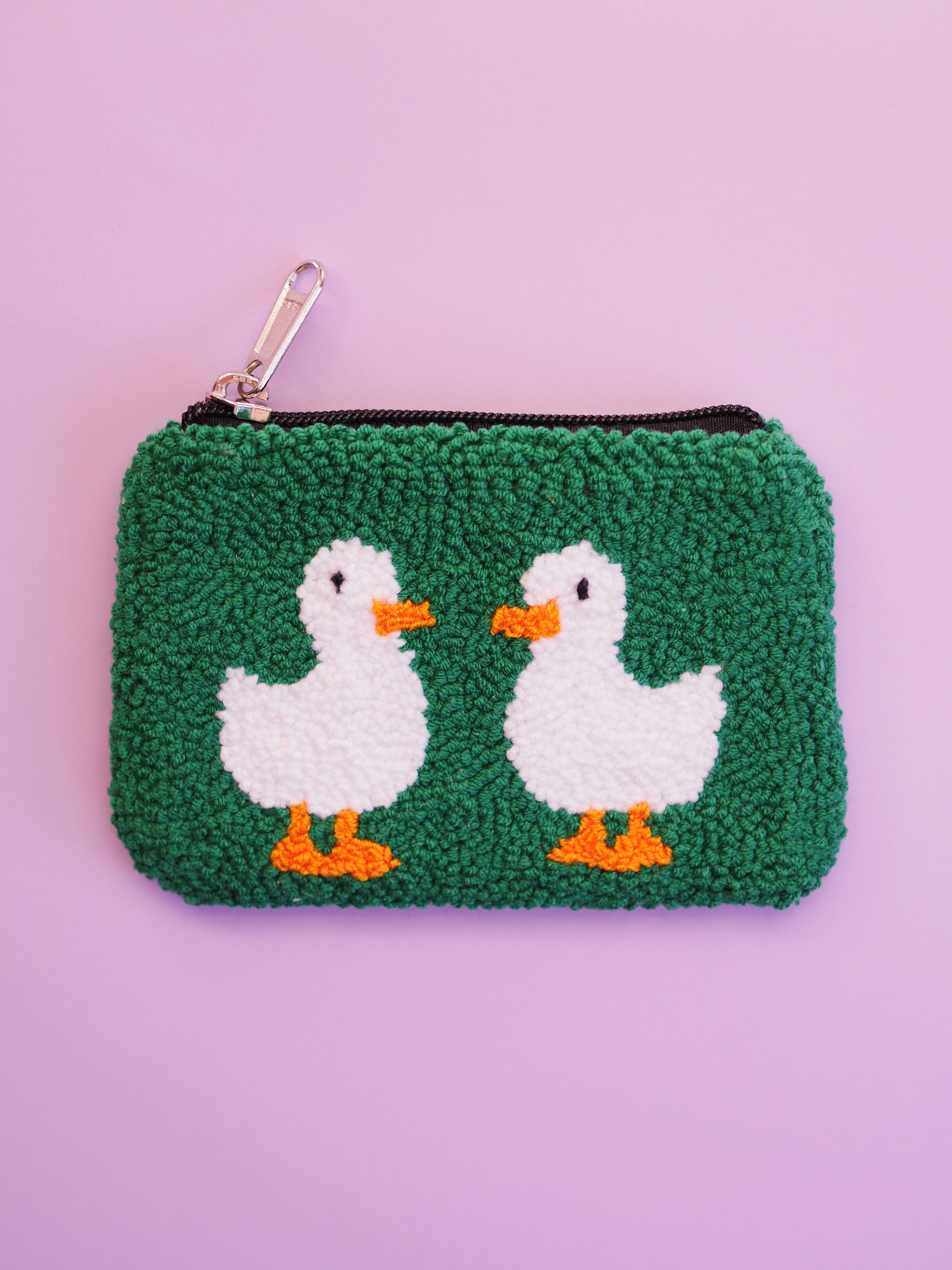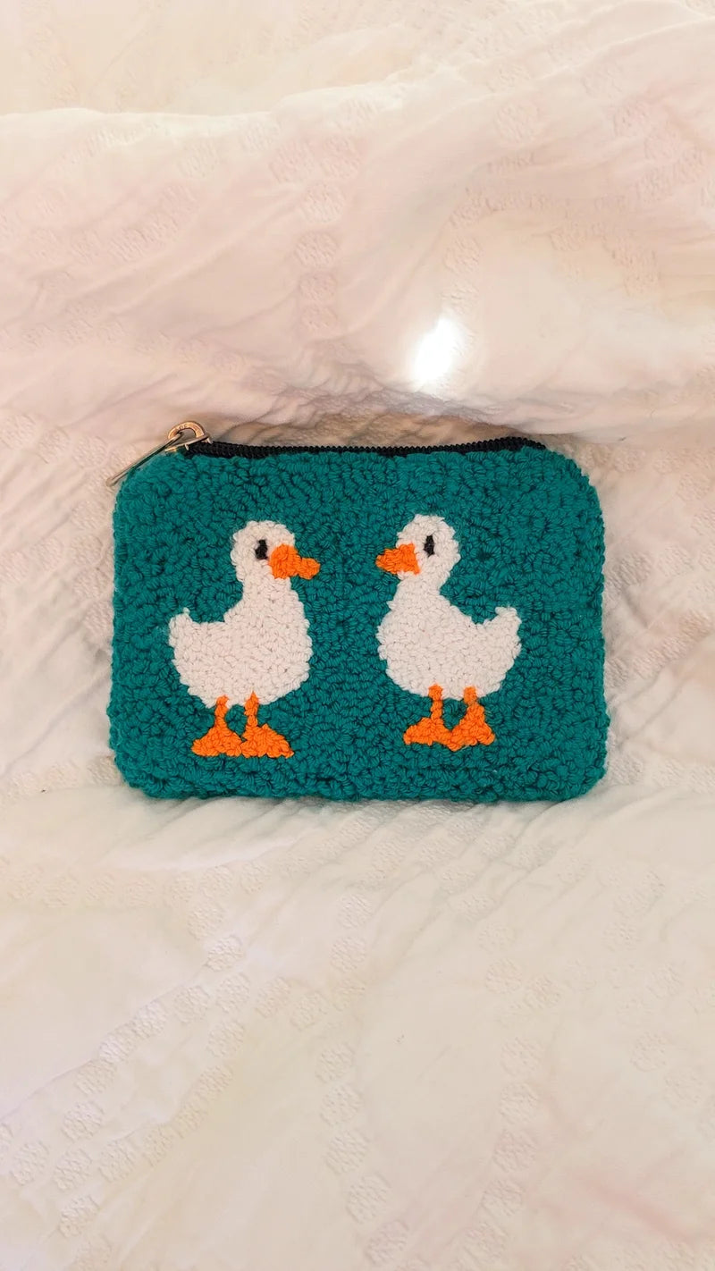 A hand punch needled wallet (zip pouch style) featuring two lil duck buddies on either side of the wallet. Dimensions of the wallet is 5 inches x 4 inches (can fit cards and cash no problem)!
