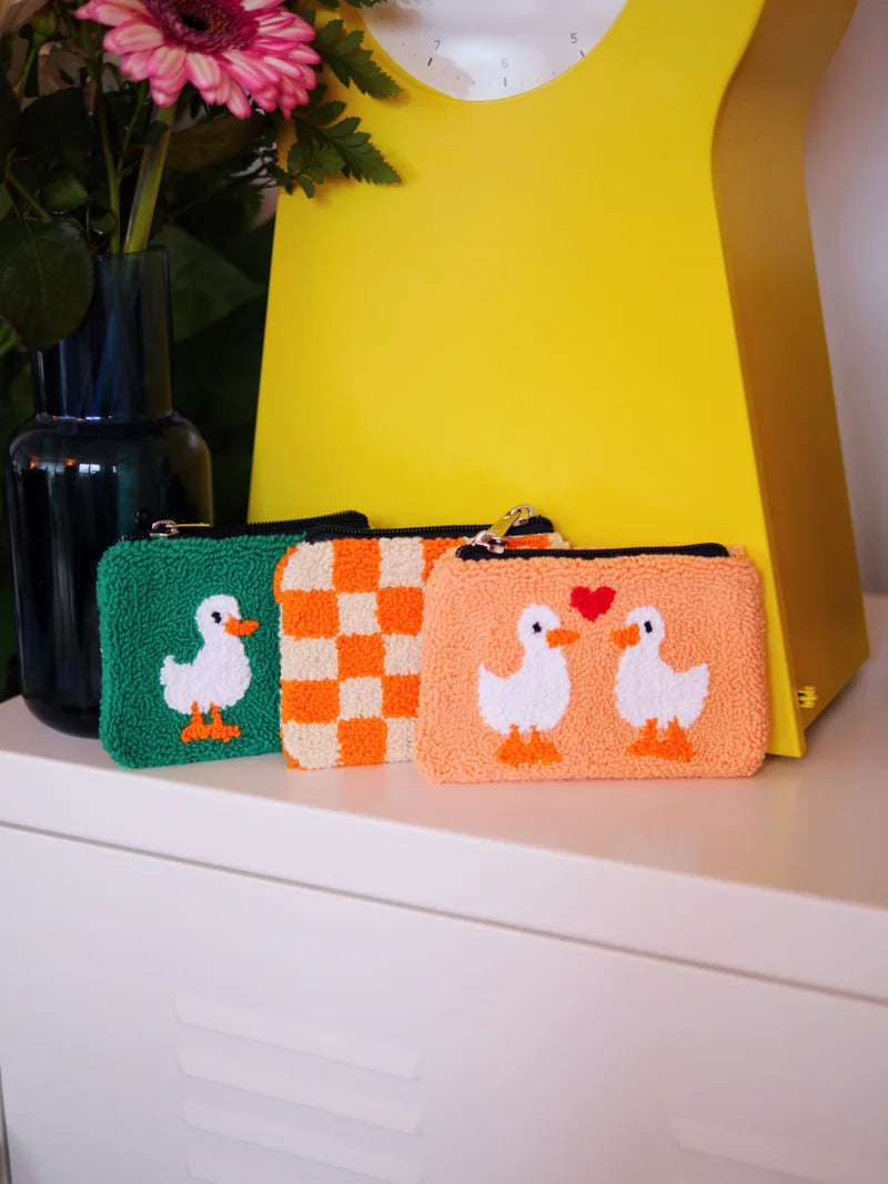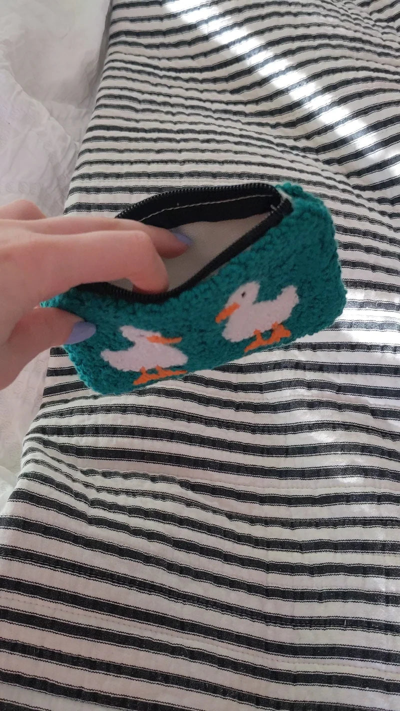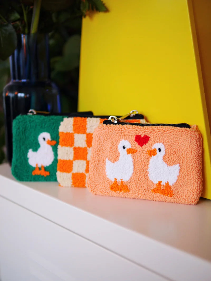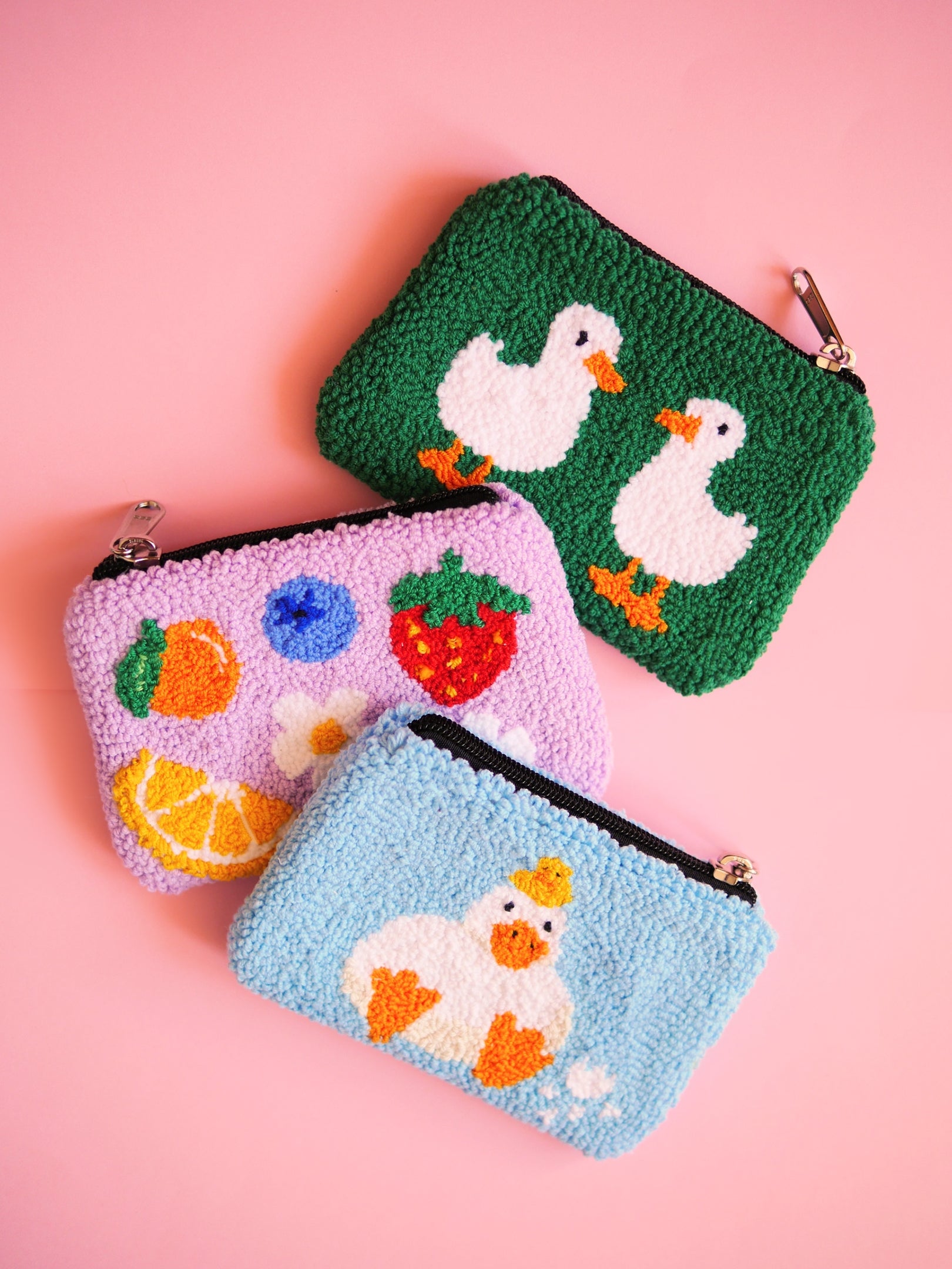 A hand punch needled wallet (zip pouch style) featuring two lil duck buddies on either side of the wallet. Dimensions of the wallet is 5 inches x 4 inches (can fit cards and cash no problem)!
