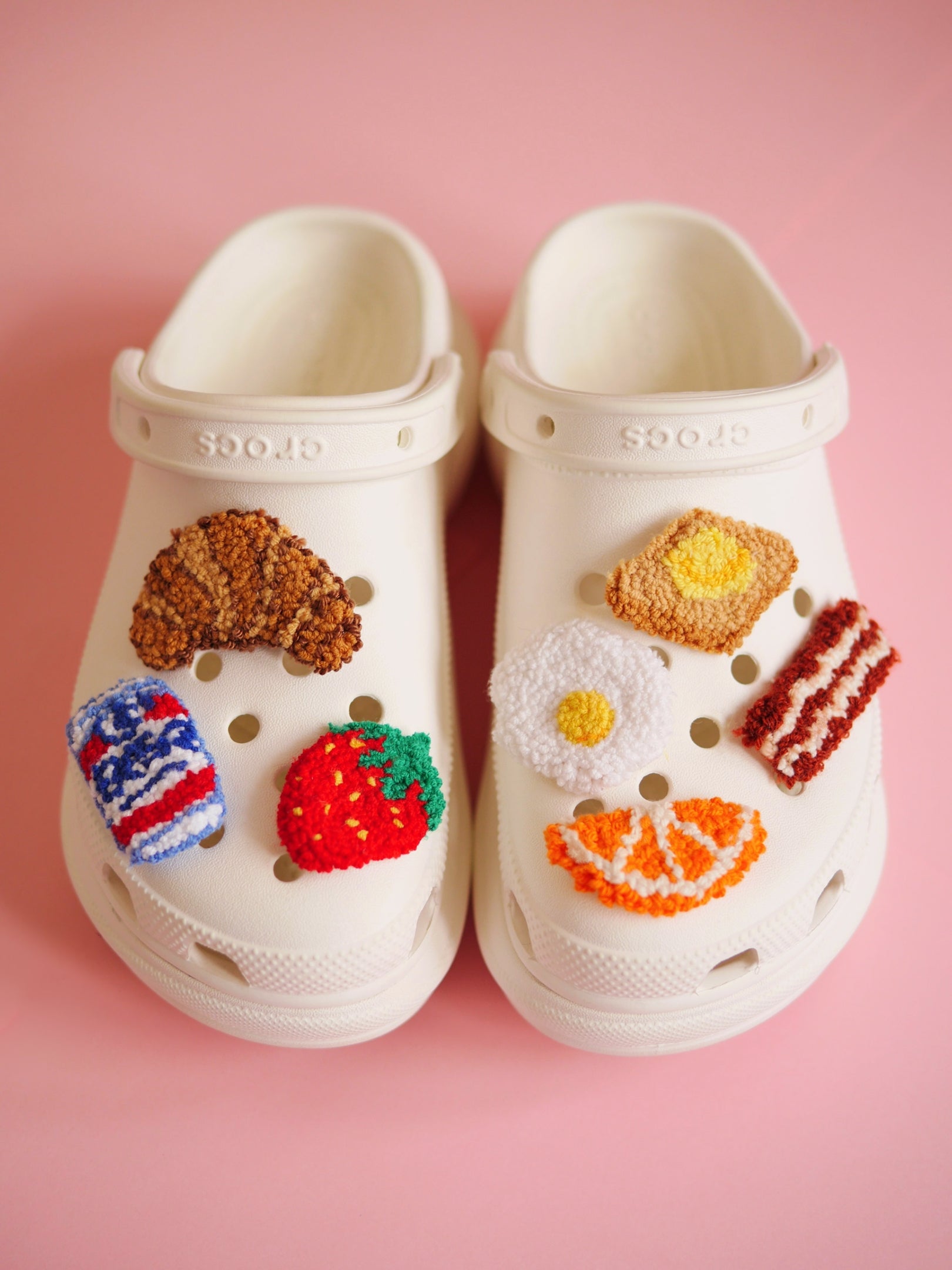 Hand punch needled shoe charms. If these charms get dirty you can hand wash them with cold water and regular detergent. Air dry flat.