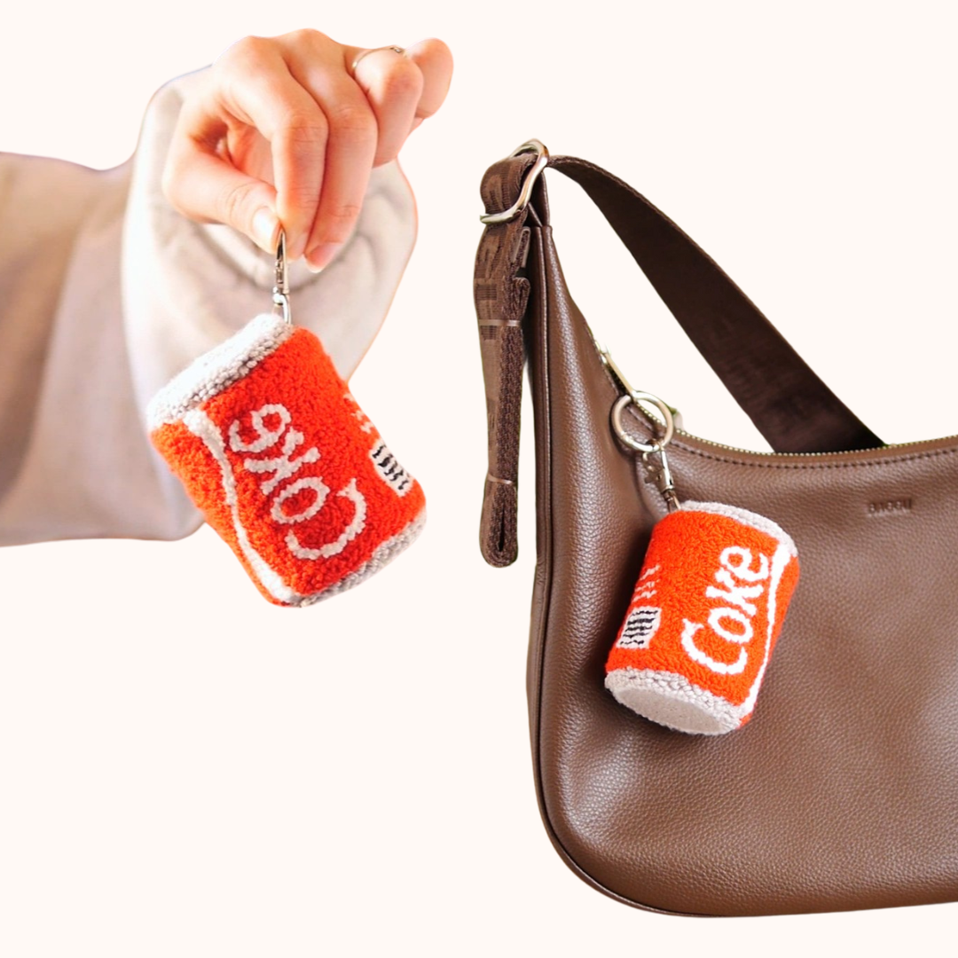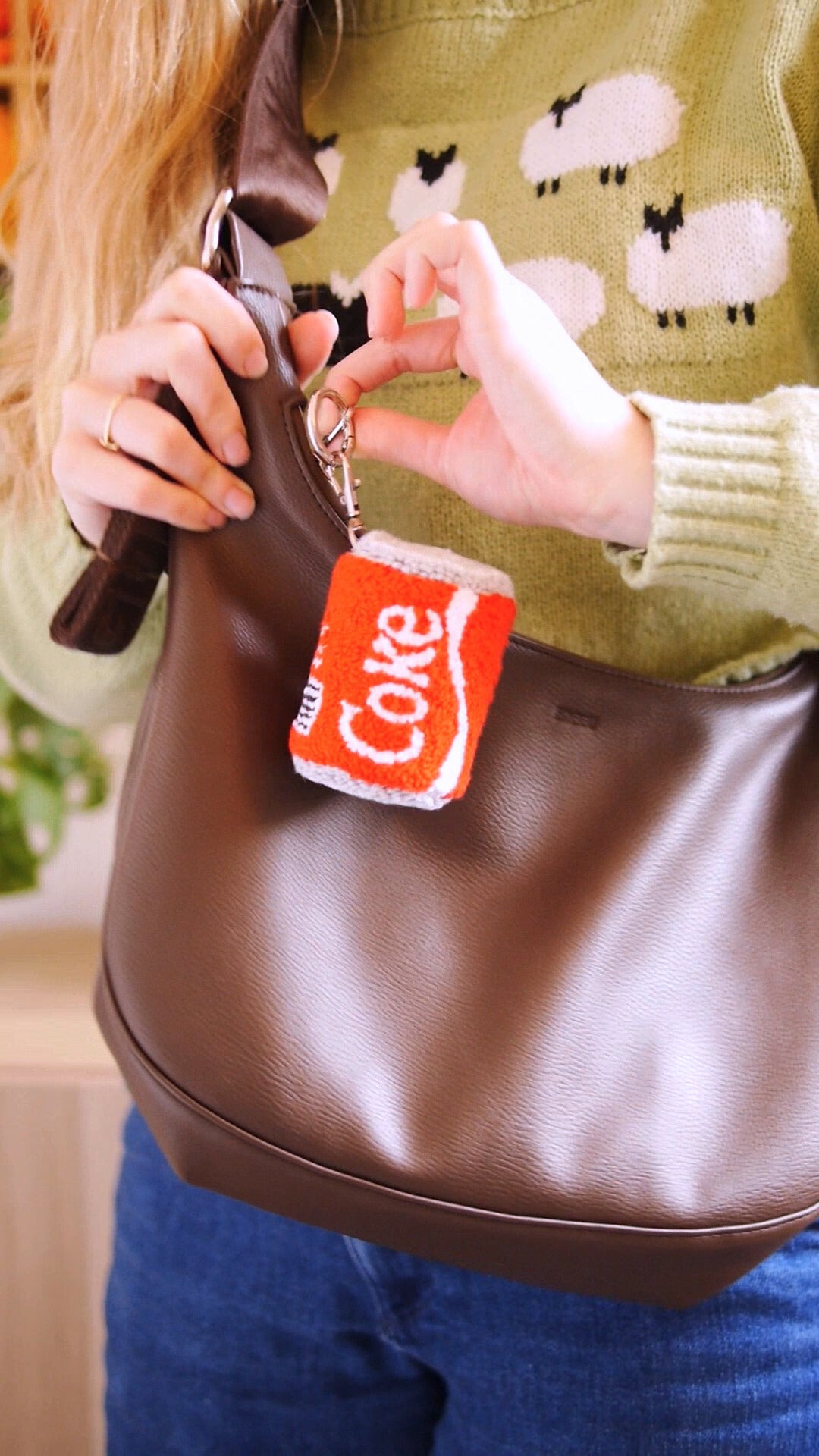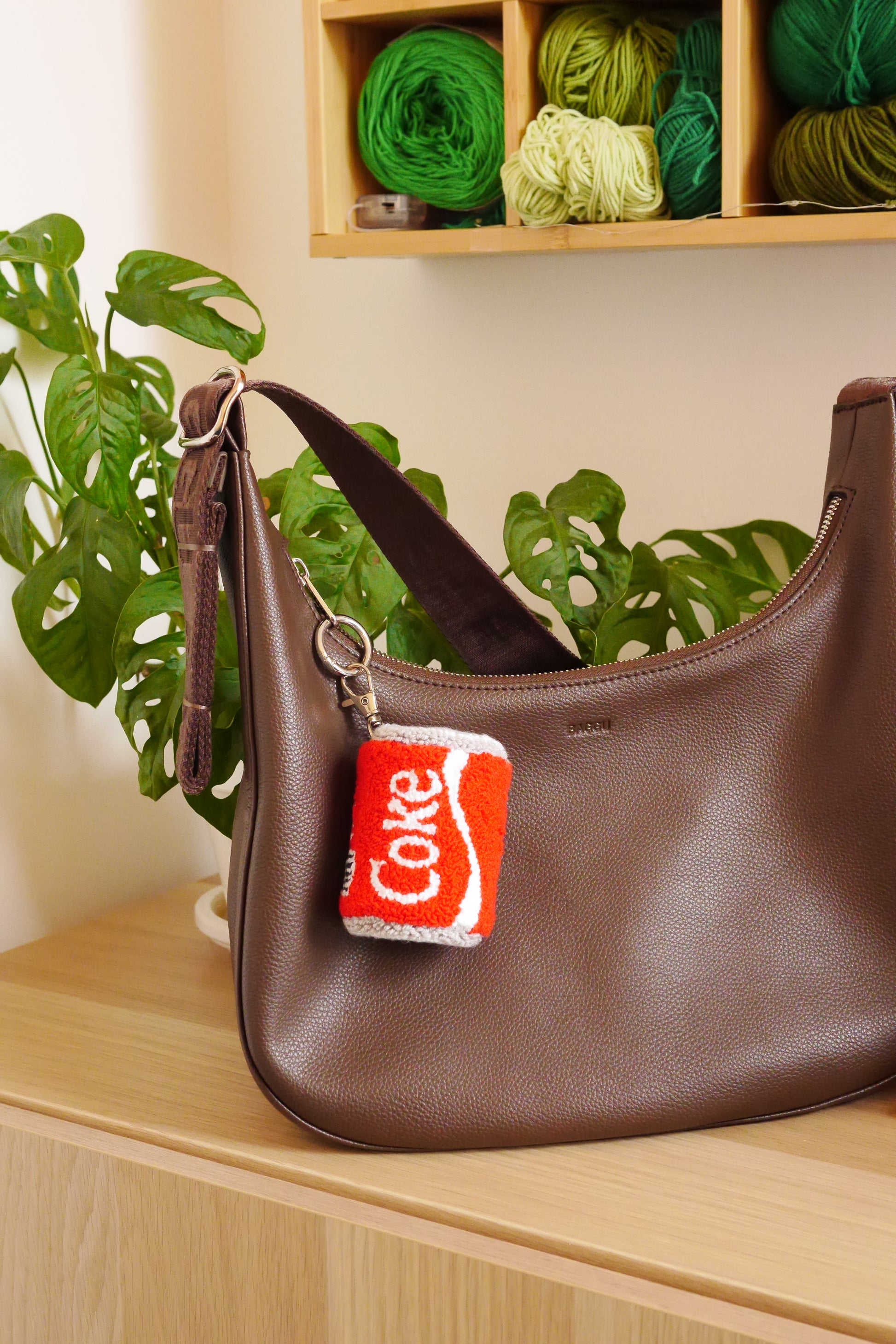 Handmade 3D punch needle bag charm (or pant charm!) featuring a cola can design. Deeeeeeelicious.