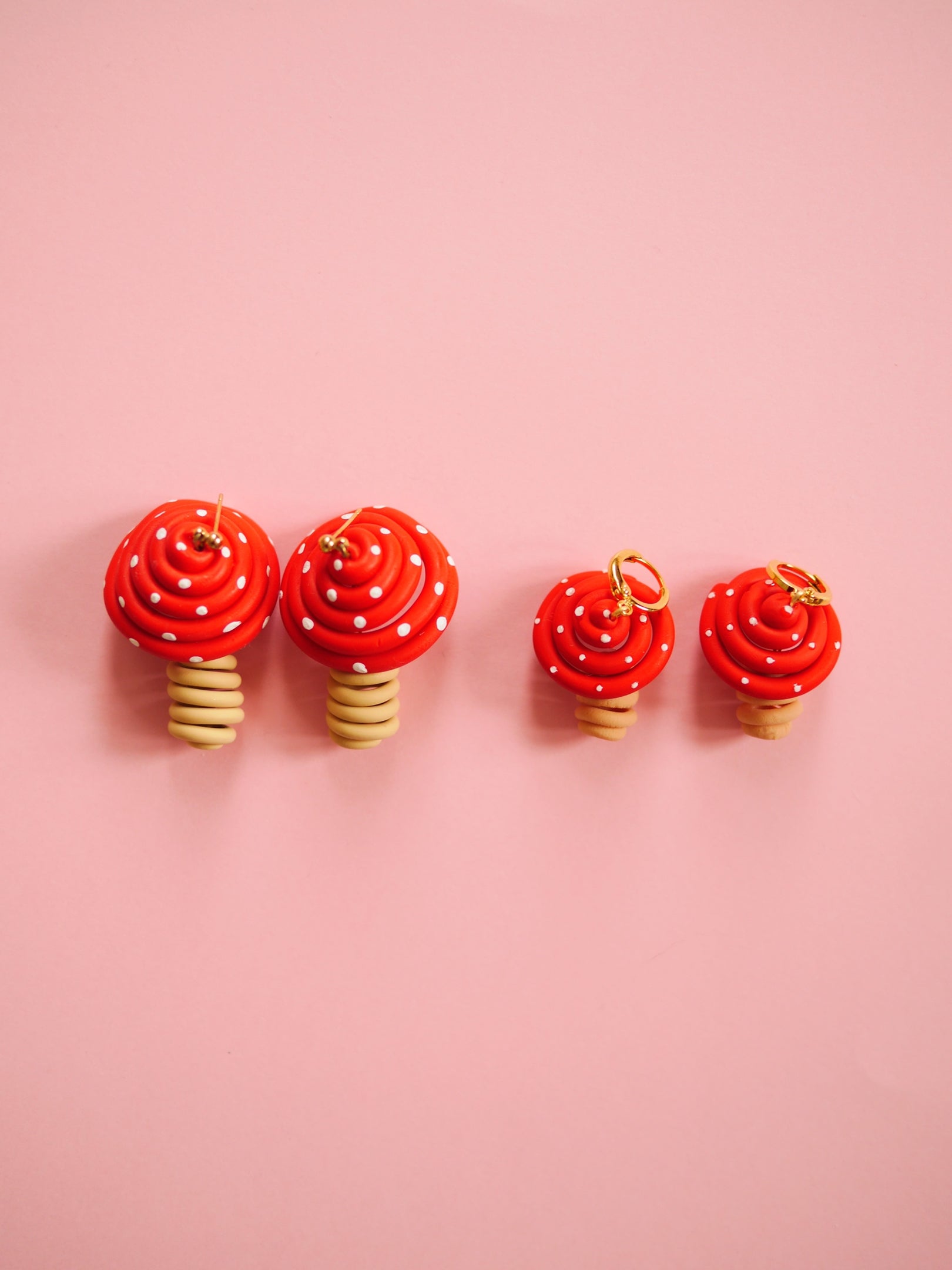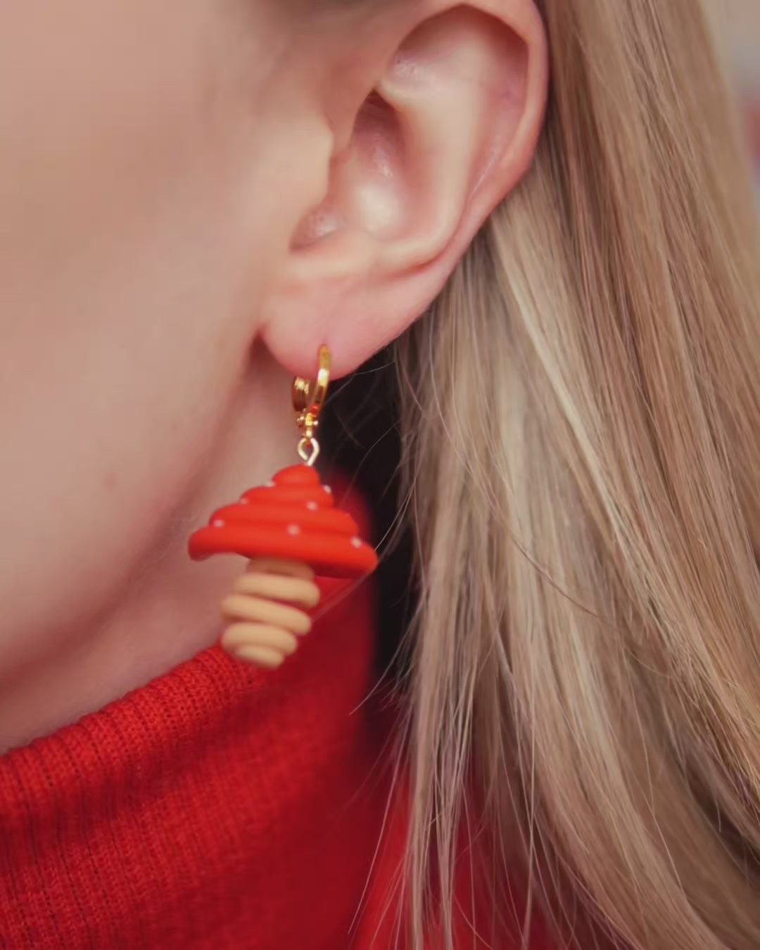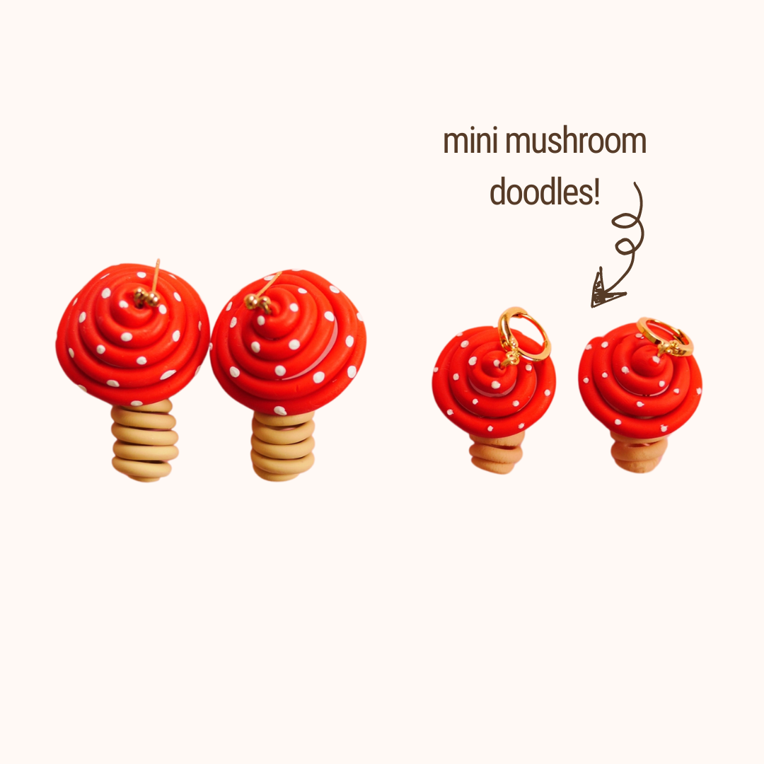 Roughly half the size of the original mushroom doodles and these ones feature huggies! Hand sculpted 3D polymer clay mushrooms. Lightweight, total piece length is ~0.75 inches. Huggies are 14k gold plated surgical stainless steel (100% hypoallergenic).