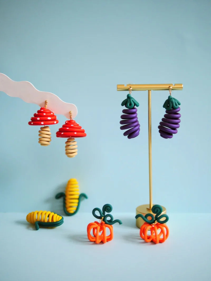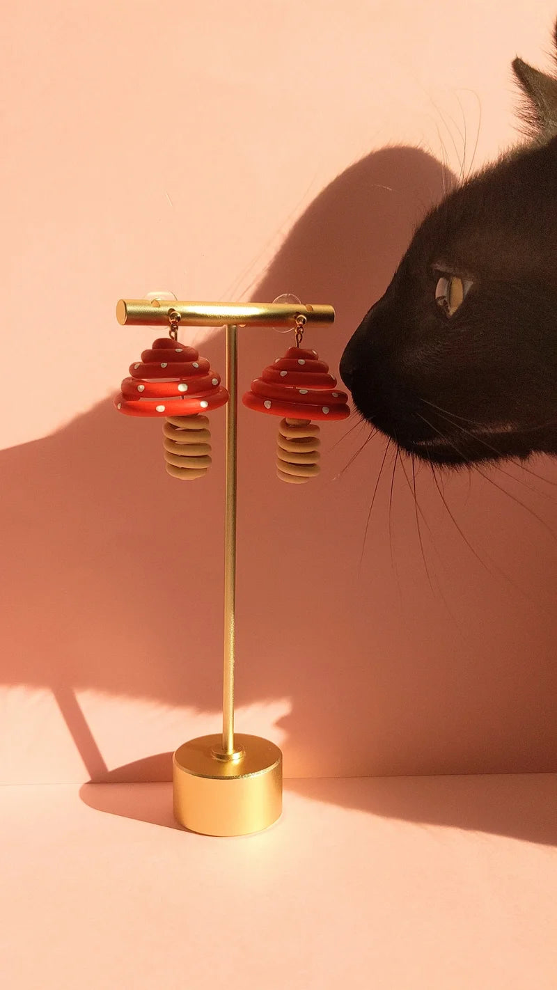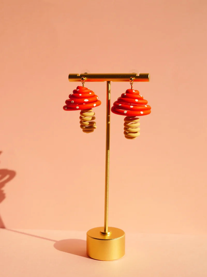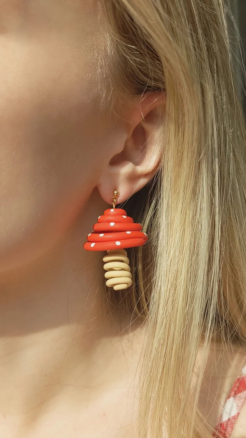 Who said jewelry couldn't be modern art? Hand sculpted 3D polymer clay mushrooms. Lightweight, total piece length is ~1.25 inches. Studs are 14k gold plated surgical stainless steel (100% hypoallergenic).