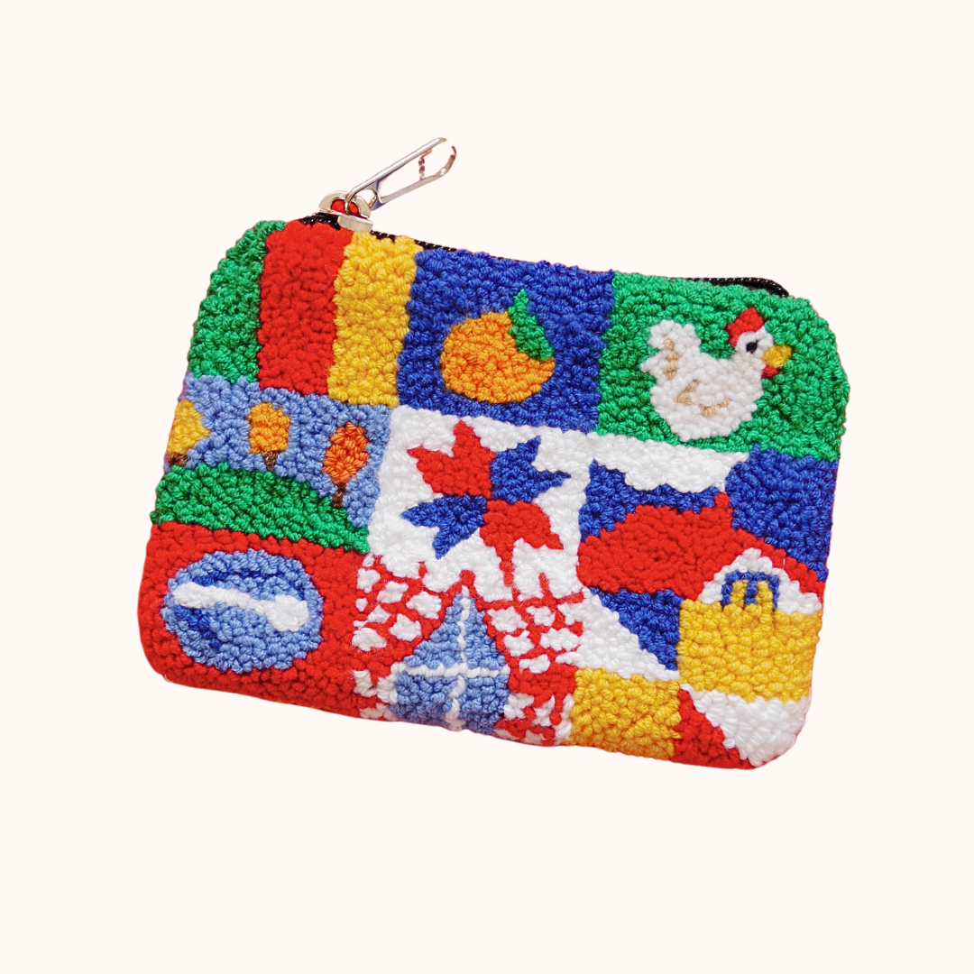 A hand punch needled wallet (zip pouch style) inspired by patchwork quilts. Dimensions of the wallet is 5 inches x 4 inches (can fit cards and cash no problem)!