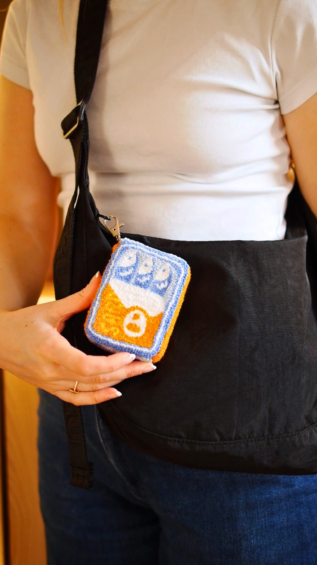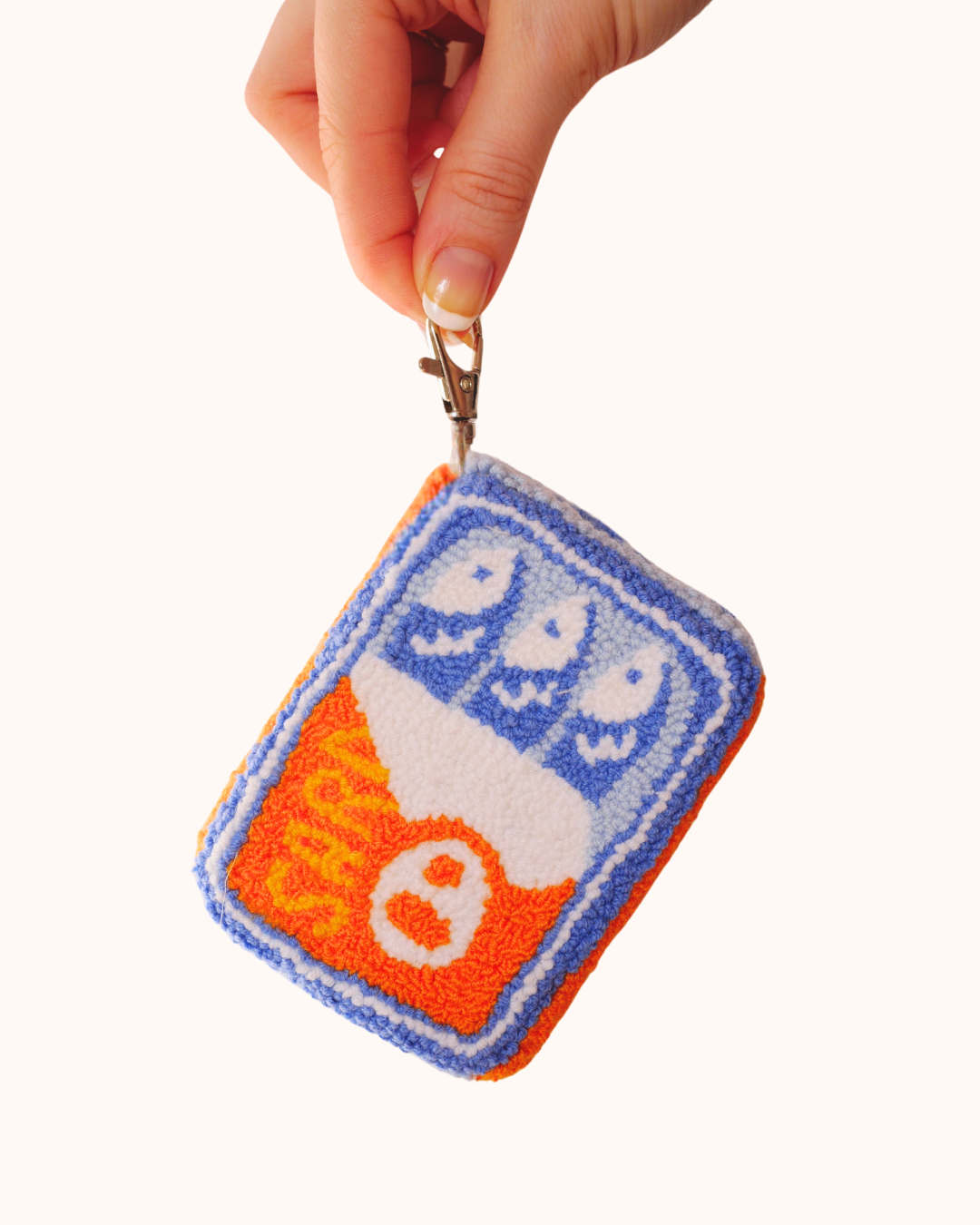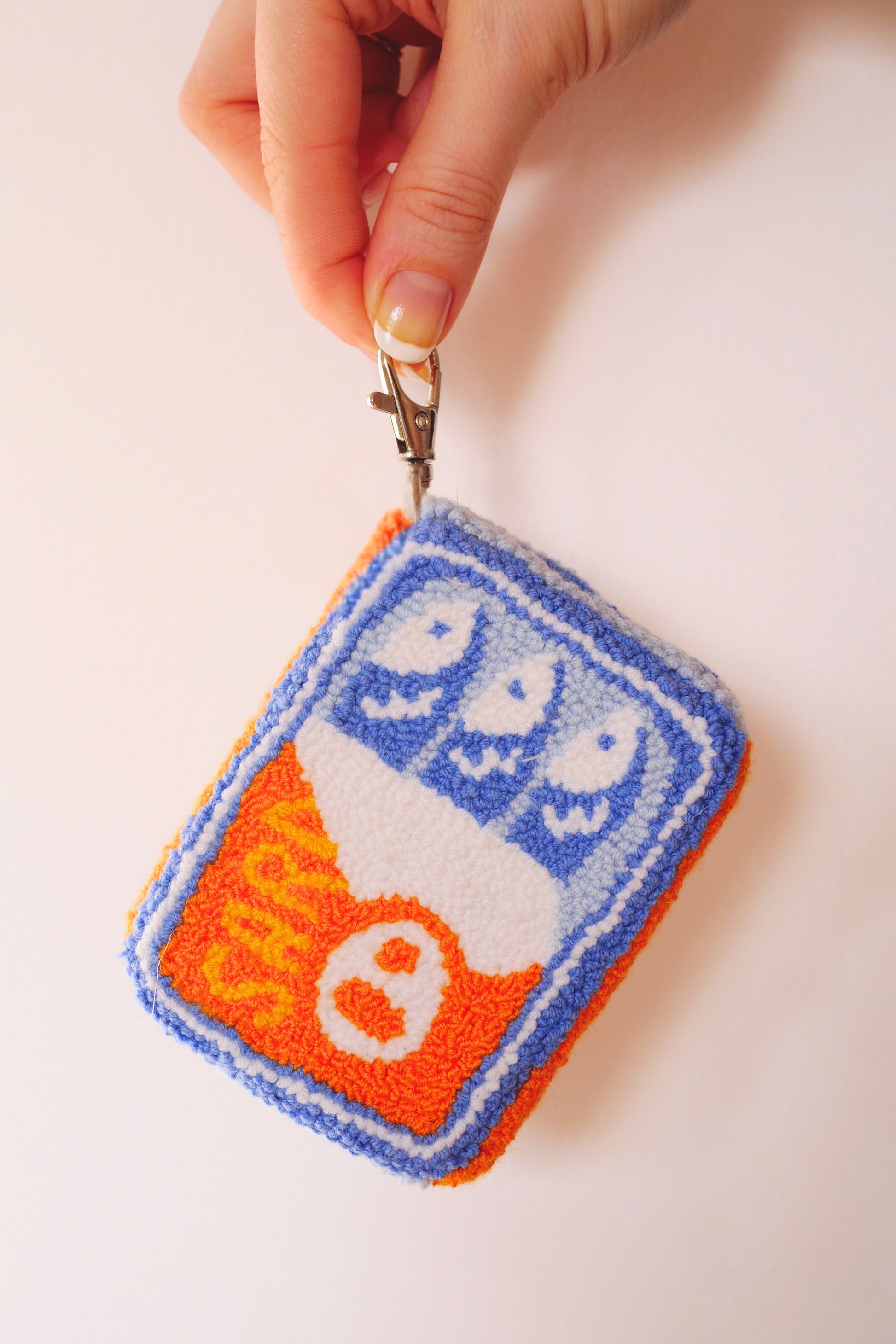 Handmade 3D punch needle bag charm (or pant charm!) featuring a sardine can design.
