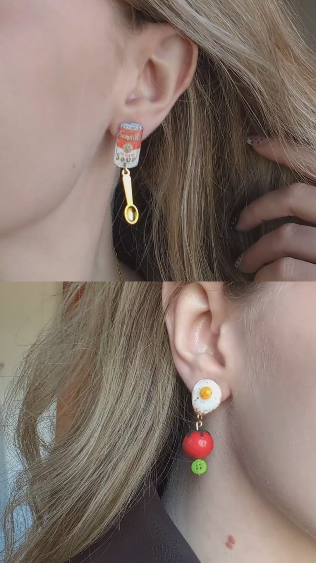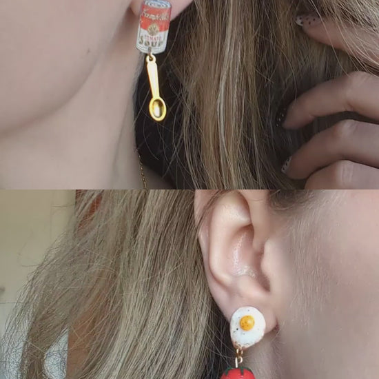 Handmade earrings featuring surgical stainless steel studs, handmade polymerclay charms, a miniature photo sealed in resin, and a miniature brass spoon. My personal favourite from this new collection.