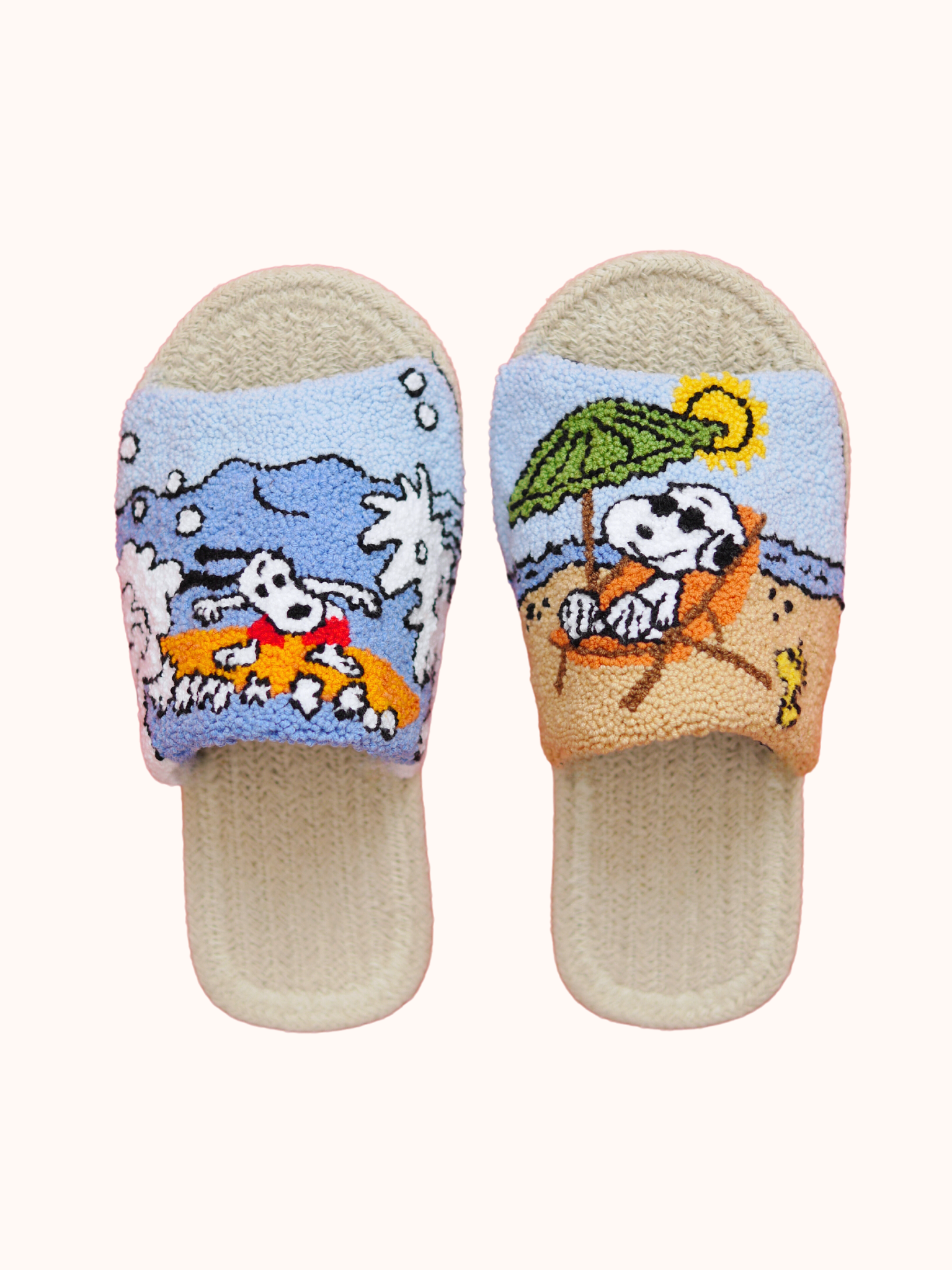 A handmade pair of embroidered slippers featuring a woven rope base. The perfect slippers / slides for summer.