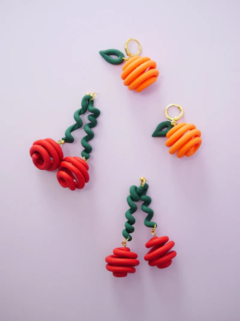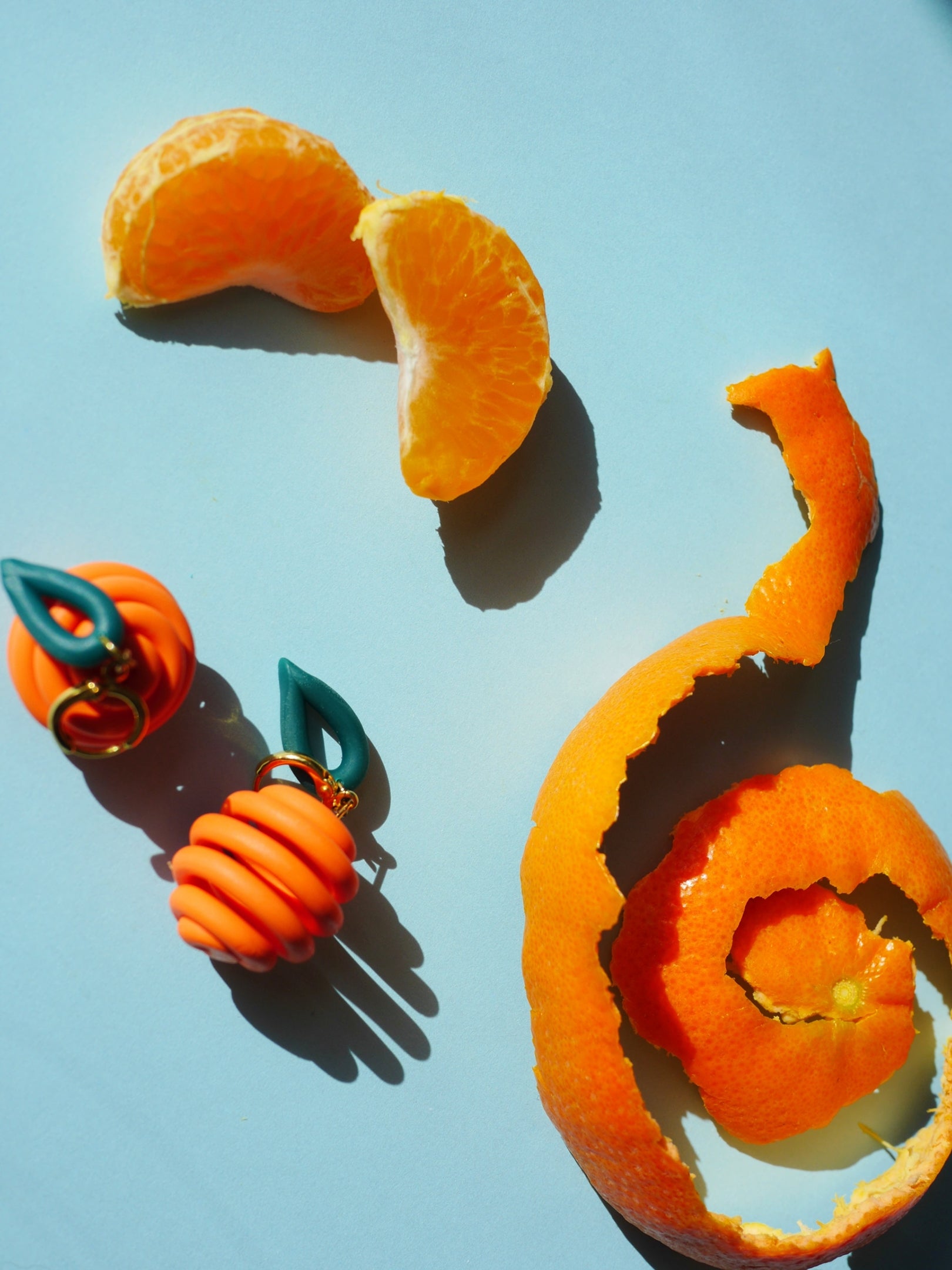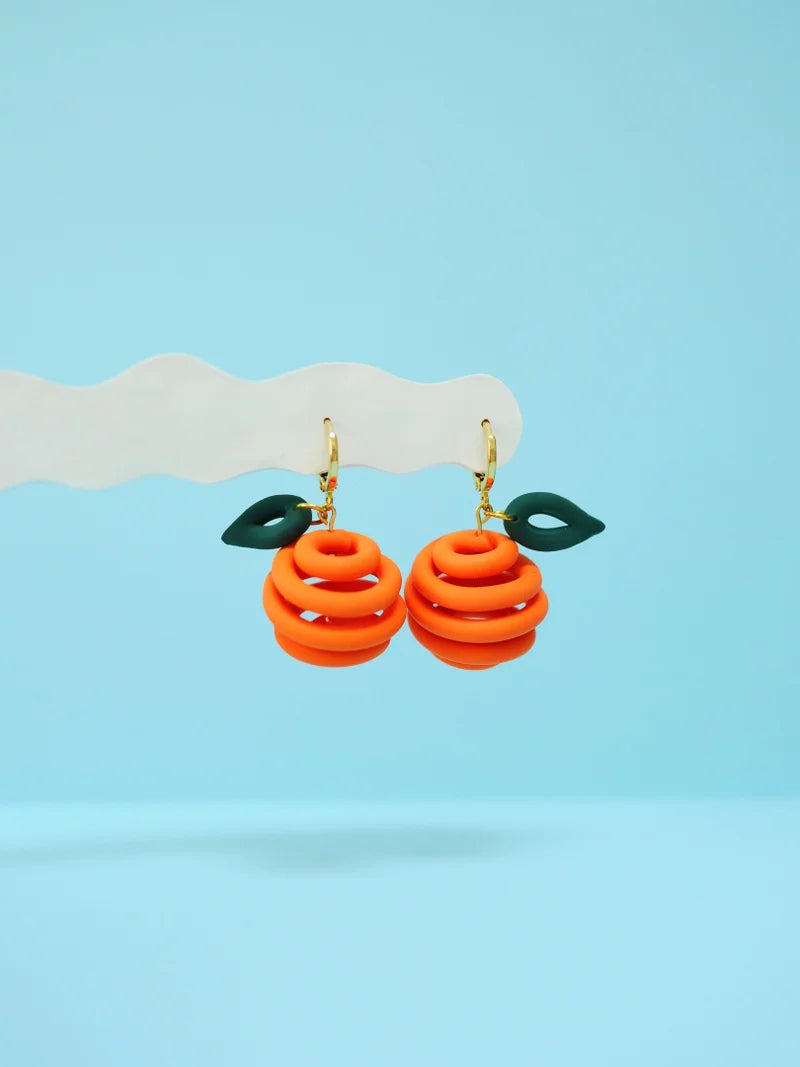 Hand sculpted 3D polymer clay oranges. Lightweight, total piece length is ~0.75 inches. Huggies are leverback 14k gold plated surgical stainless steel (100% hypoallergenic).
