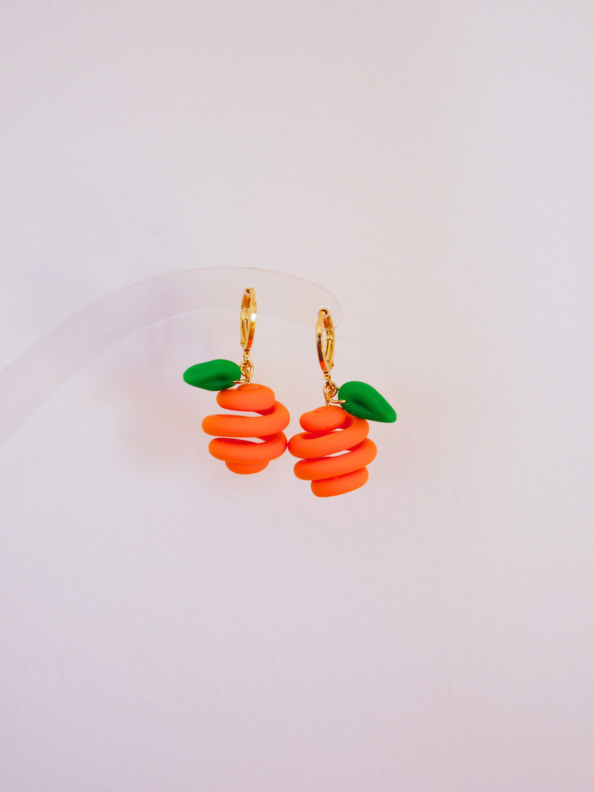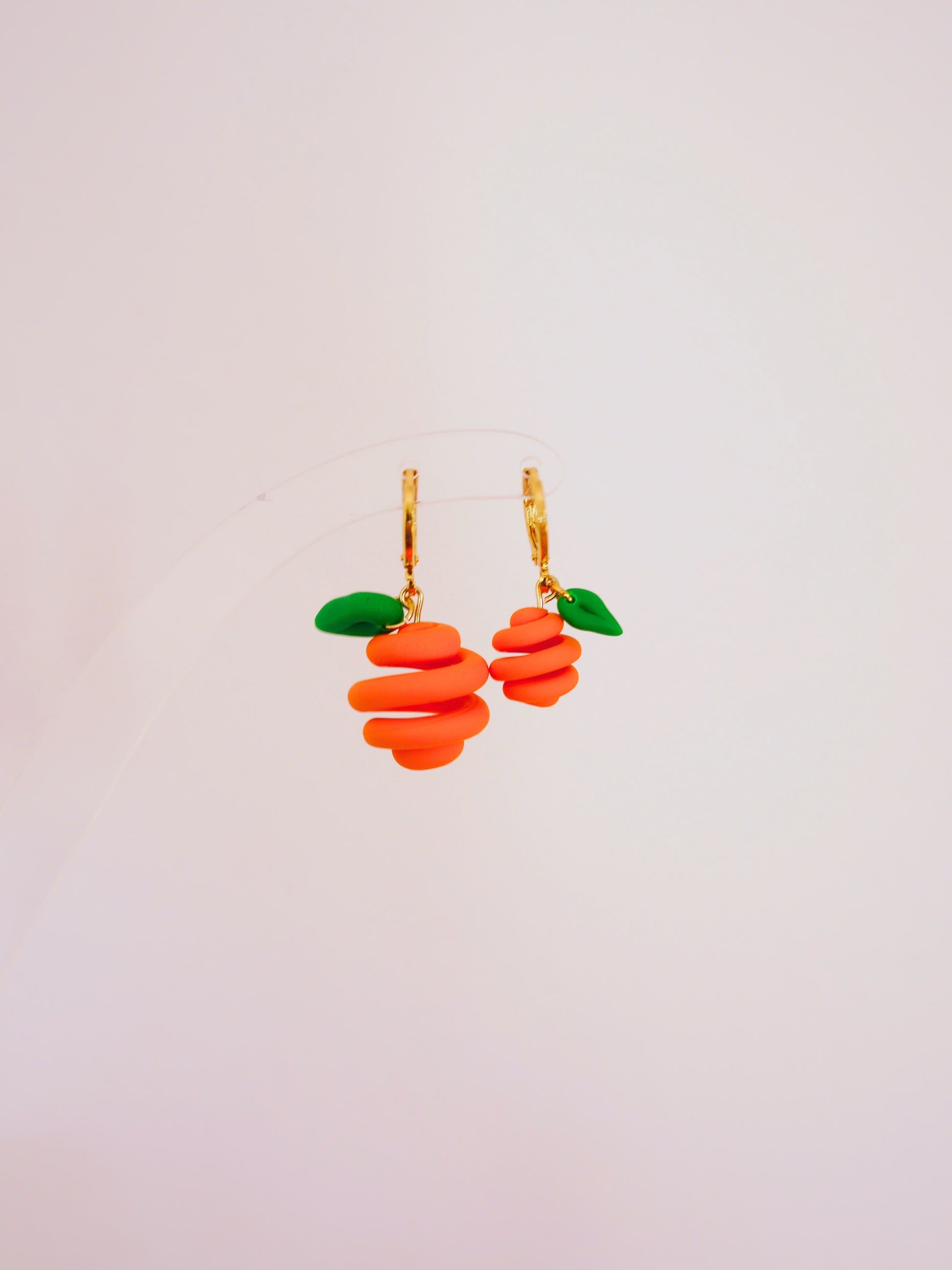 Hand sculpted 3D polymer clay oranges. Lightweight, total piece length for the Large oranges is ~0.75 inches, Small oranges total piece length is ~1cm. Huggies are leverback 14k gold plated surgical stainless steel (100% hypoallergenic).