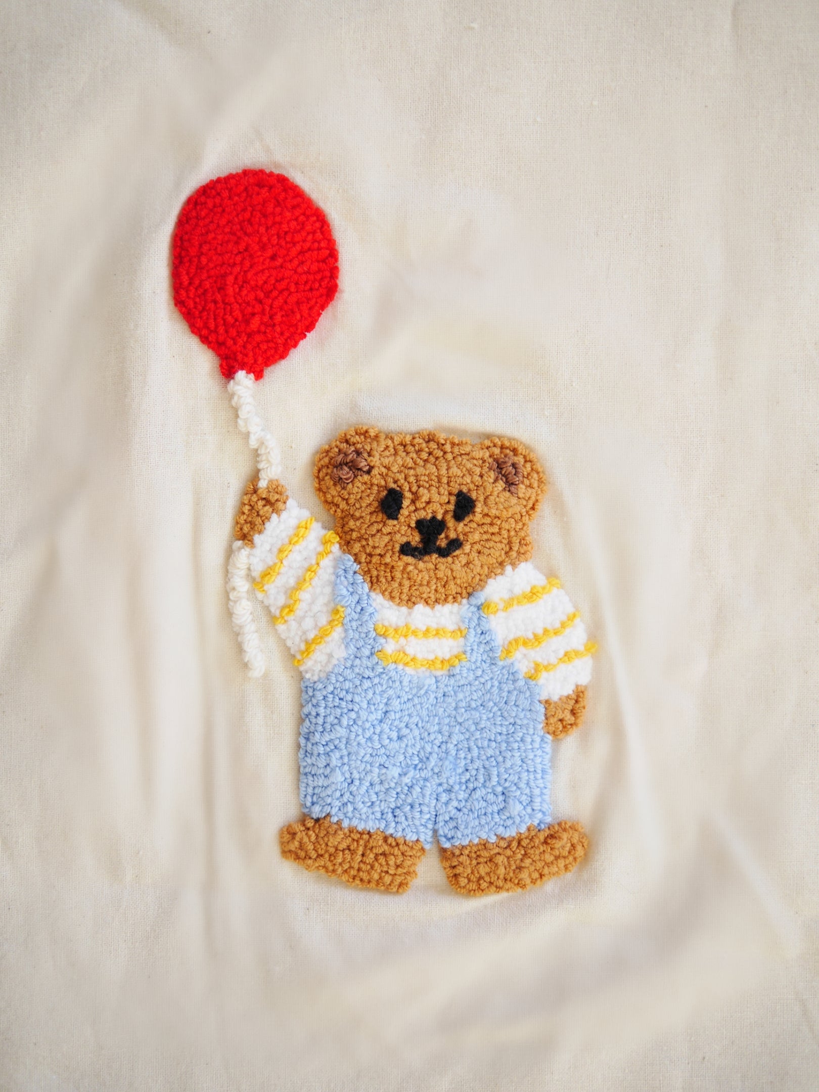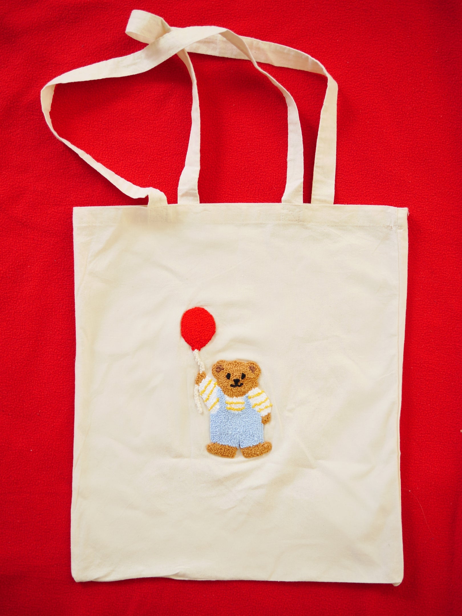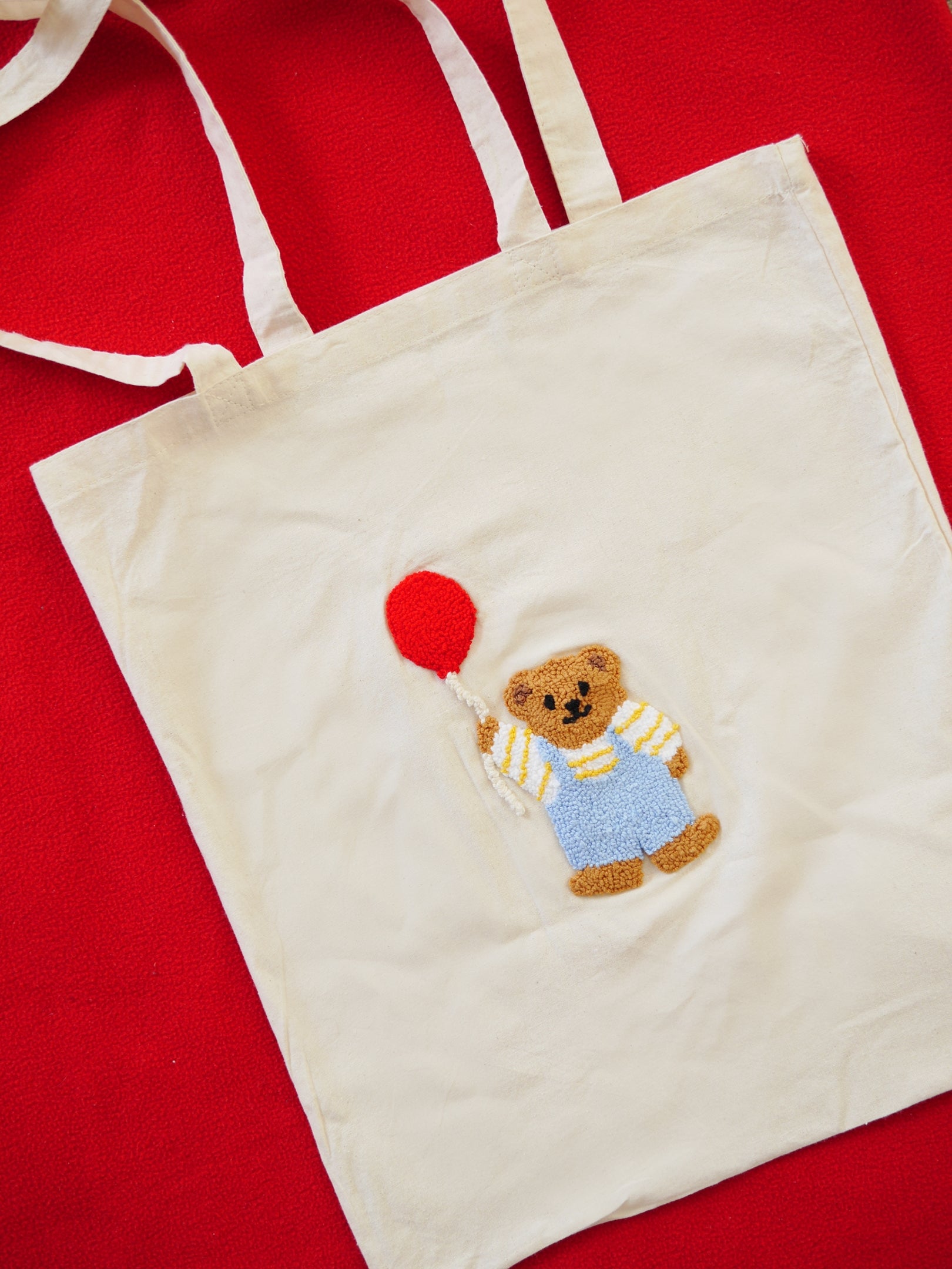A handmade cotton tote bag featuring a hand punched little bear design.