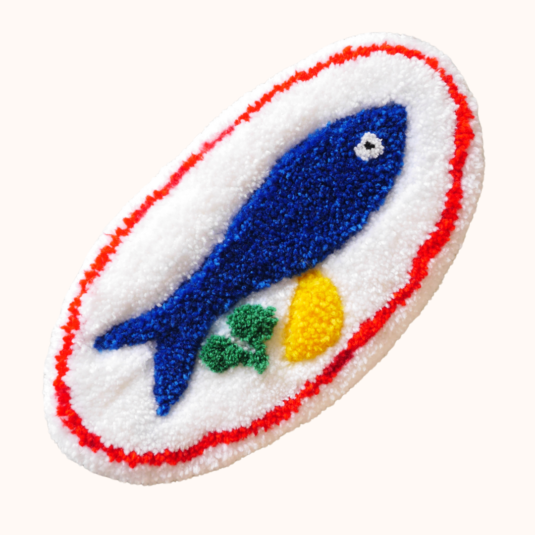 A handmade tufted fish dinner rug. Measures ~ 12 inches x 6.5 inches. Hang it on your wall, display it on your table, use it as a mug rug, it's up to you!