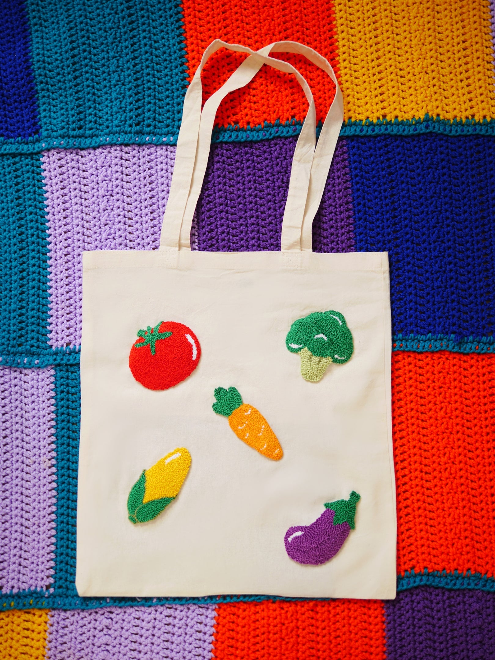A handmade cotton tote bag featuring a selection of delcious veggies.