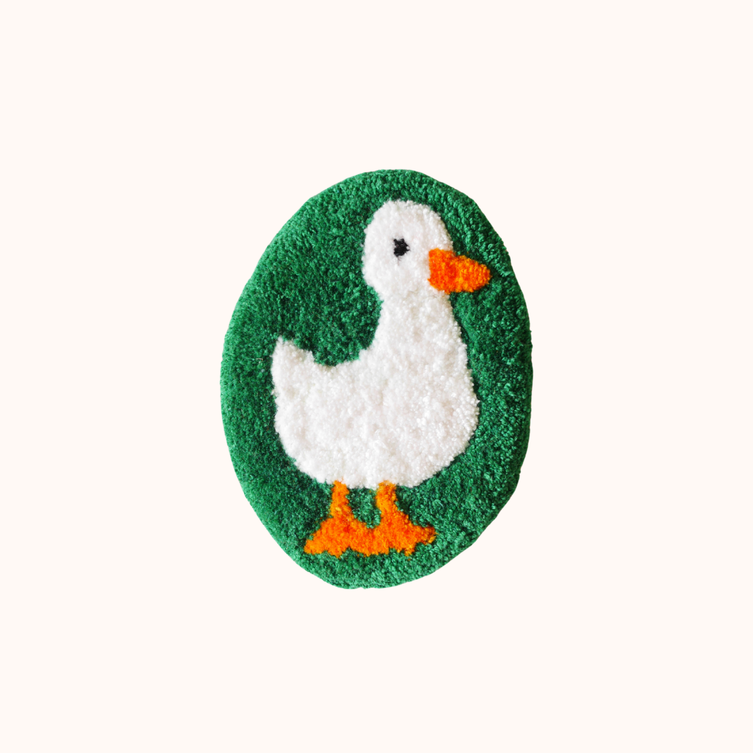A handmade tufted duck rug. Measures ~ 5 inches x 4 inches. Hang it on your wall, display it on your table, use it as a mug rug, it's up to you!