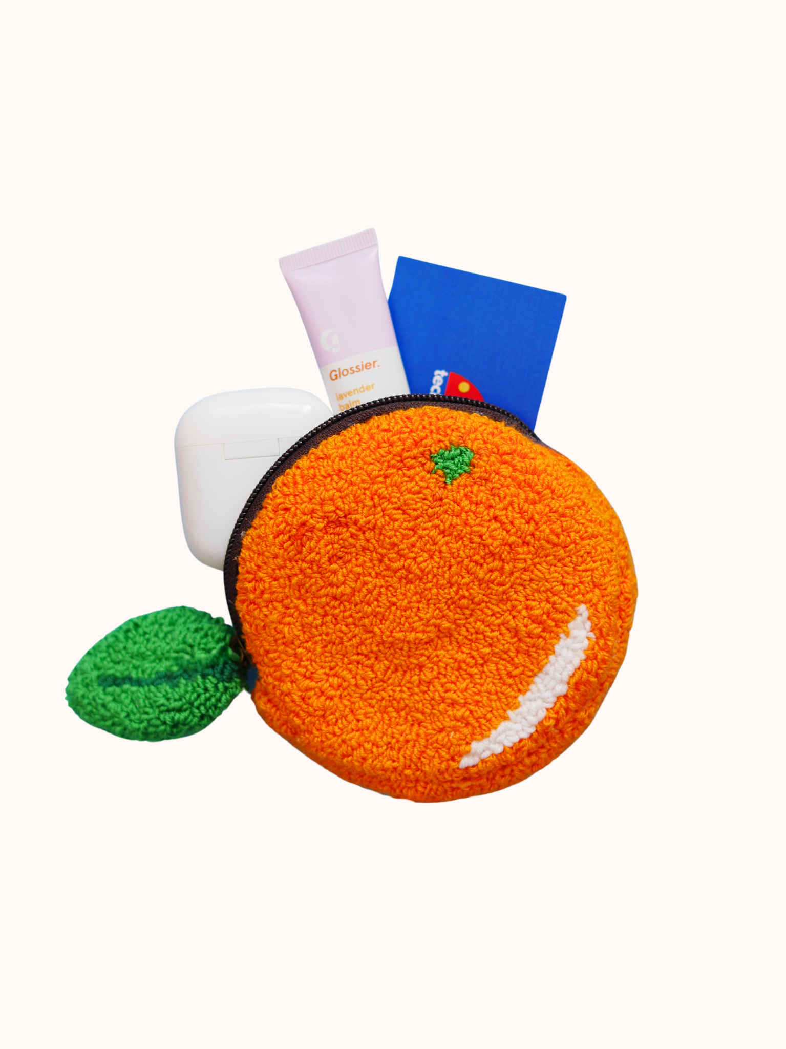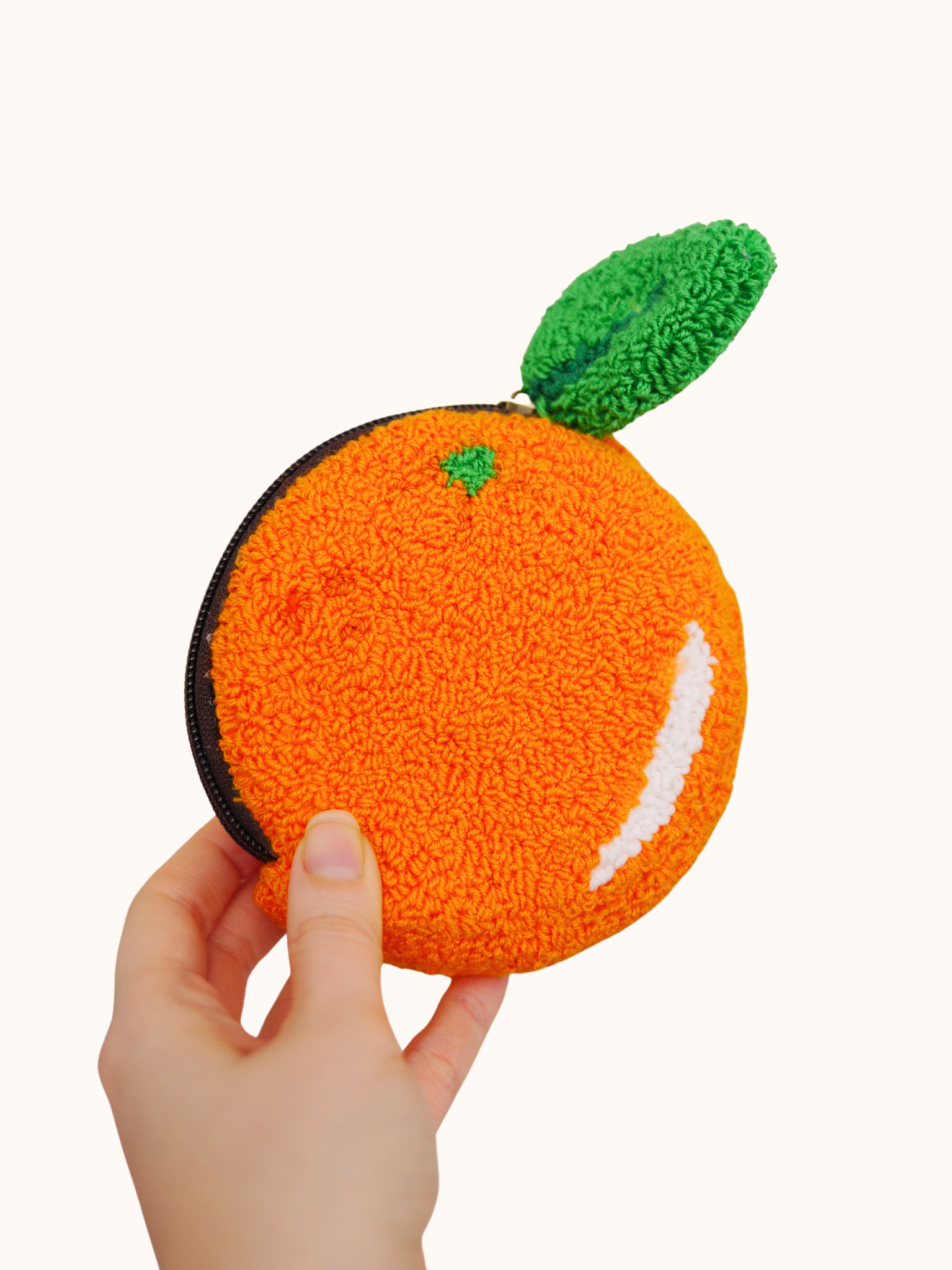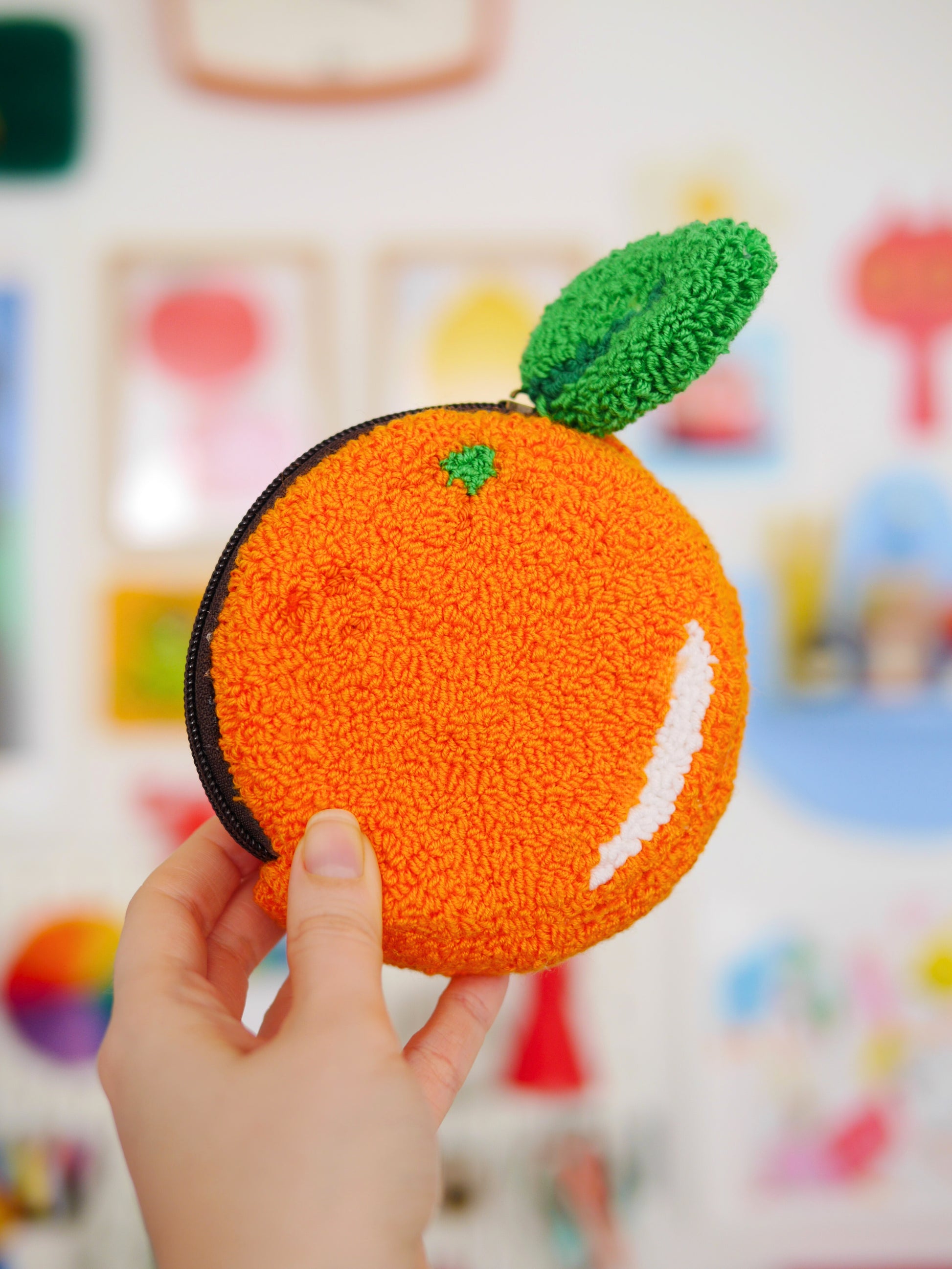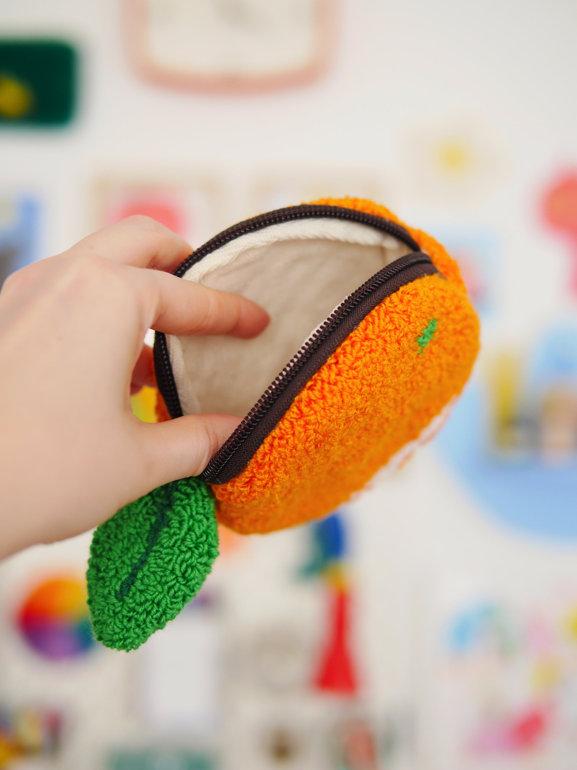 A hand punch needled wallet (zip pouch style) in the shape of an orange! Complete with leaf zipper. Dimensions of the wallet is ~4.5 inches all around (can fit cards, cash, and even some headphones and lip balm no problem)!